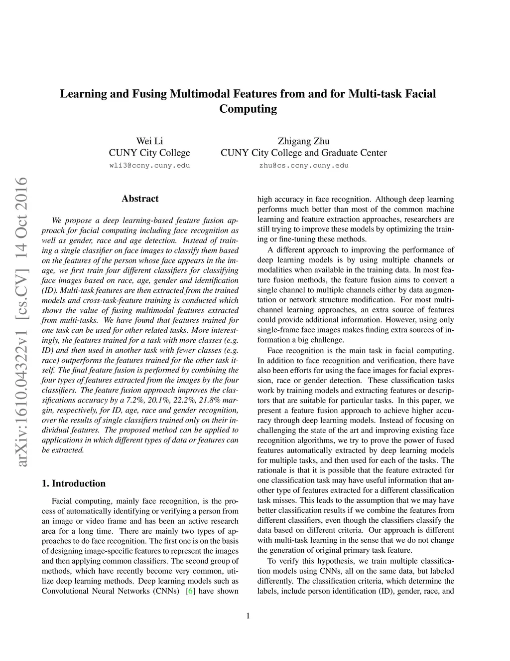 We propose a deep learning-based feature fusion approach for facial computing including face recognition as well as gender, race and age detection. Instead of training a single classifier on face images to classify them based on the features of the person whose face appears in the image, we first train four different classifiers for classifying face images based on race, age, gender and identification (ID). Multi-task features are then extracted from the trained models and cross-task-feature training is conducted which shows the value of fusing multimodal features extracted from multi-tasks. We have found that features trained for one task can be used for other related tasks. More interestingly, the features trained for a task with more classes (e.g. ID) and then used in another task with fewer classes (e.g. race) outperforms the features trained for the other task itself. The final feature fusion is performed by combining the four types of features extracted from the images by the four classifiers. The feature fusion approach improves the classifications accuracy by a 7.2%, 20.1%, 22.2%, 21.8% margin, respectively, for ID, age, race and gender recognition, over the results of single classifiers trained only on their individual features. The proposed method can be applied to applications in which different types of data or features can be extracted.