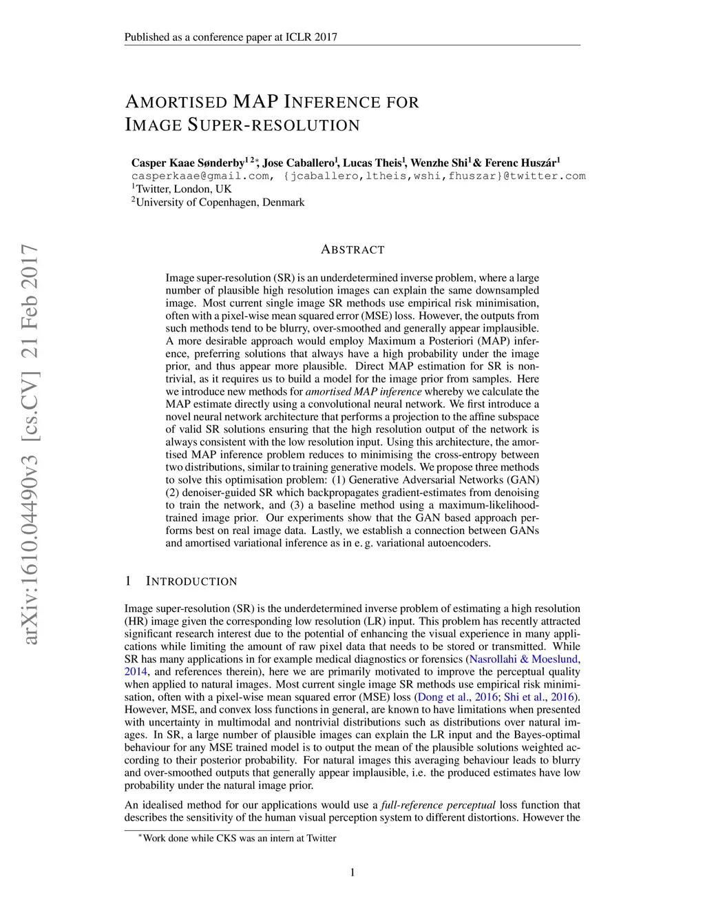 Image super-resolution (SR) is an underdetermined inverse problem, where a large number of plausible high-resolution images can explain the same downsampled image. Most current single image SR methods use empirical risk minimisation, often with a pixel-wise mean squared error (MSE) loss. However, the outputs from such methods tend to be blurry, over-smoothed and generally appear implausible. A more desirable approach would employ Maximum a Posteriori (MAP) inference, preferring solutions that always have a high probability under the image prior, and thus appear more plausible. Direct MAP estimation for SR is non-trivial, as it requires us to build a model for the image prior from samples. Furthermore, MAP inference is often performed via optimisation-based iterative algorithms which don't compare well with the efficiency of neural-network-based alternatives. Here we introduce new methods for amortised MAP inference whereby we calculate the MAP estimate directly using a convolutional neural network. We first introduce a novel neural network architecture that performs a projection to the affine subspace of valid SR solutions ensuring that the high resolution output of the network is always consistent with the low resolution input. We show that, using this architecture, the amortised MAP inference problem reduces to minimising the cross-entropy between two distributions, similar to training generative models. We propose three methods to solve this optimisation problem: (1) Generative Adversarial Networks (GAN) (2) denoiser-guided SR which backpropagates gradient-estimates from denoising to train the network, and (3) a baseline method using a maximum-likelihood-trained image prior. Our experiments show that the GAN based approach performs best on real image data. Lastly, we establish a connection between GANs and amortised variational inference as in e.g. variational autoencoders.