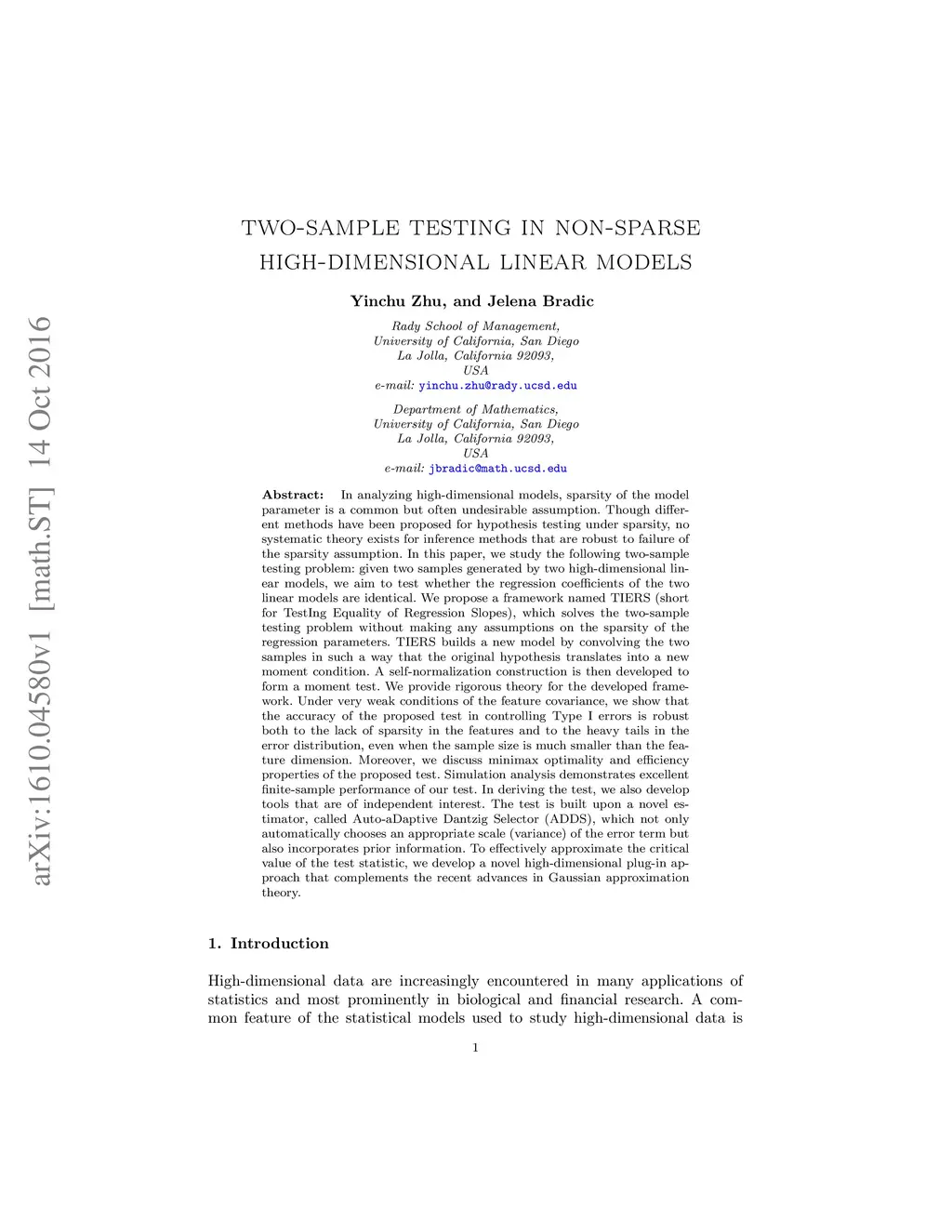 In analyzing high-dimensional models, sparsity of the model parameter is a common but often undesirable assumption. In this paper, we study the following two-sample testing problem: given two samples generated by two high-dimensional linear models, we aim to test whether the regression coefficients of the two linear models are identical. We propose a framework named TIERS (short for TestIng Equality of Regression Slopes), which solves the two-sample testing problem without making any assumptions on the sparsity of the regression parameters. TIERS builds a new model by convolving the two samples in such a way that the original hypothesis translates into a new moment condition. A self-normalization construction is then developed to form a moment test. We provide rigorous theory for the developed framework. Under very weak conditions of the feature covariance, we show that the accuracy of the proposed test in controlling Type I errors is robust both to the lack of sparsity in the features and to the heavy tails in the error distribution, even when the sample size is much smaller than the feature dimension. Moreover, we discuss minimax optimality and efficiency properties of the proposed test. Simulation analysis demonstrates excellent finite-sample performance of our test. In deriving the test, we also develop tools that are of independent interest. The test is built upon a novel estimator, called Auto-aDaptive Dantzig Selector (ADDS), which not only automatically chooses an appropriate scale of the error term but also incorporates prior information. To effectively approximate the critical value of the test statistic, we develop a novel high-dimensional plug-in approach that complements the recent advances in Gaussian approximation theory.
