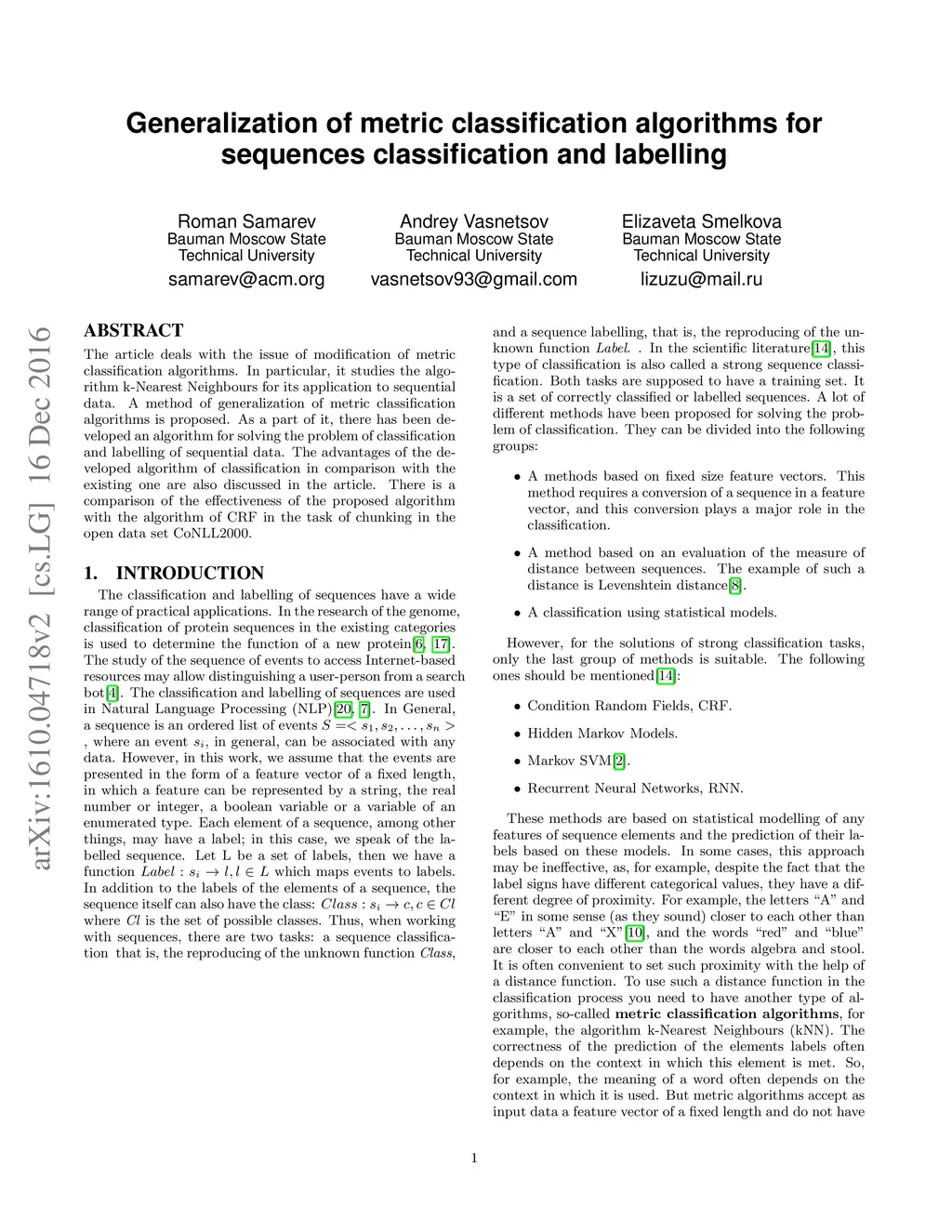 The article deals with the issue of modification of metric classification algorithms. In particular, it studies the algorithm k-Nearest Neighbours for its application to sequential data. A method of generalization of metric classification algorithms is proposed. As a part of it, there has been developed an algorithm for solving the problem of classification and labelling of sequential data. The advantages of the developed algorithm of classification in comparison with the existing one are also discussed in the article. There is a comparison of the effectiveness of the proposed algorithm with the algorithm of CRF in the task of chunking in the open data set CoNLL2000.