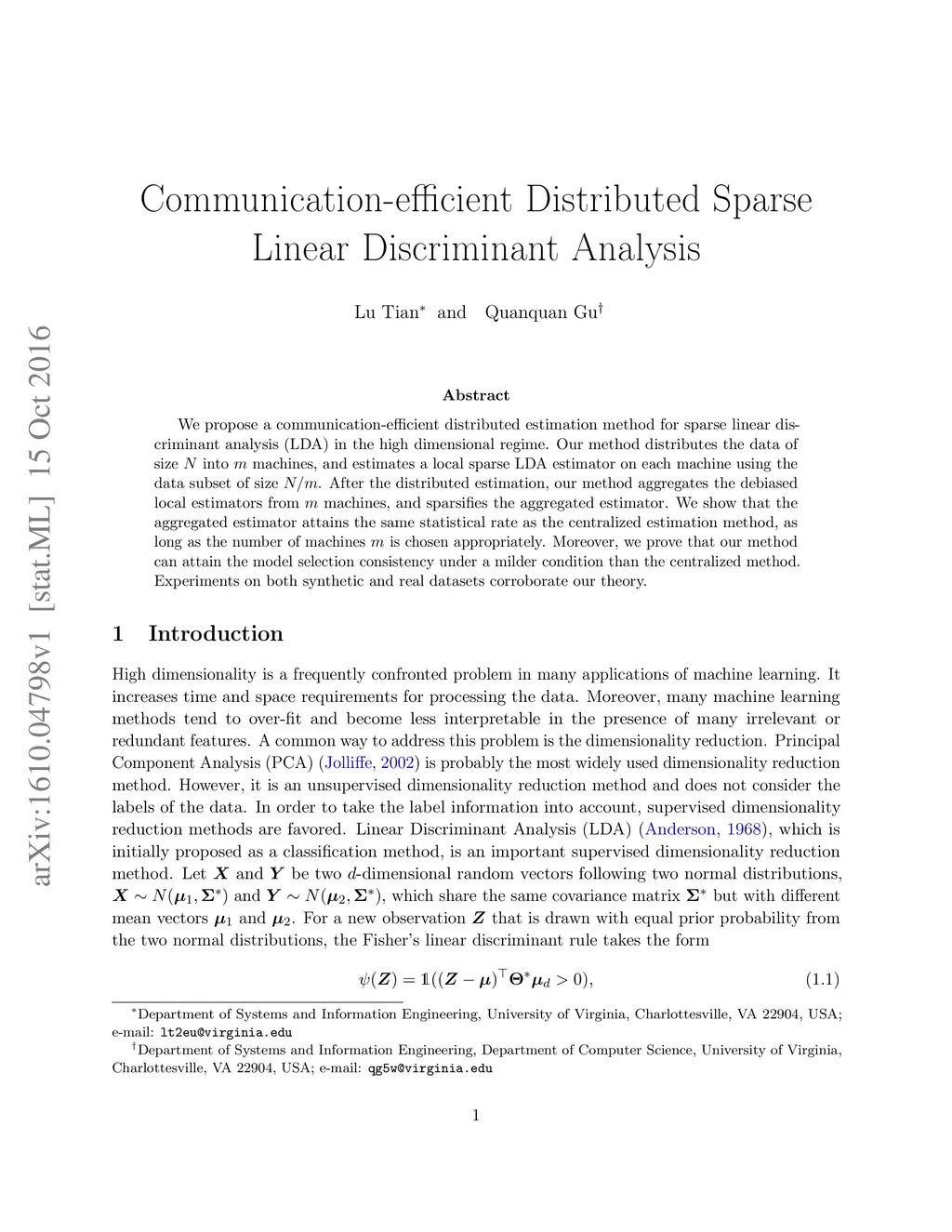 We propose a communication-efficient distributed estimation method for sparse linear discriminant analysis (LDA) in the high dimensional regime. Our method distributes the data of size into machines, and estimates a local sparse LDA estimator on each machine using the data subset of size . After the distributed estimation, our method aggregates the debiased local estimators from machines, and sparsifies the aggregated estimator. We show that the aggregated estimator attains the same statistical rate as the centralized estimation method, as long as the number of machines is chosen appropriately. Moreover, we prove that our method can attain the model selection consistency under a milder condition than the centralized method. Experiments on both synthetic and real datasets corroborate our theory.