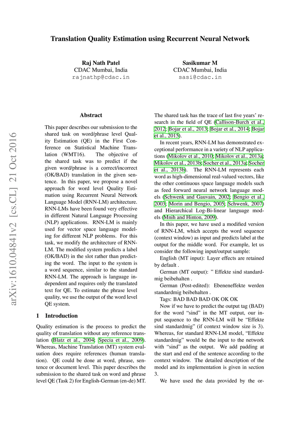 Translation Quality Estimation using Recurrent Neural Network