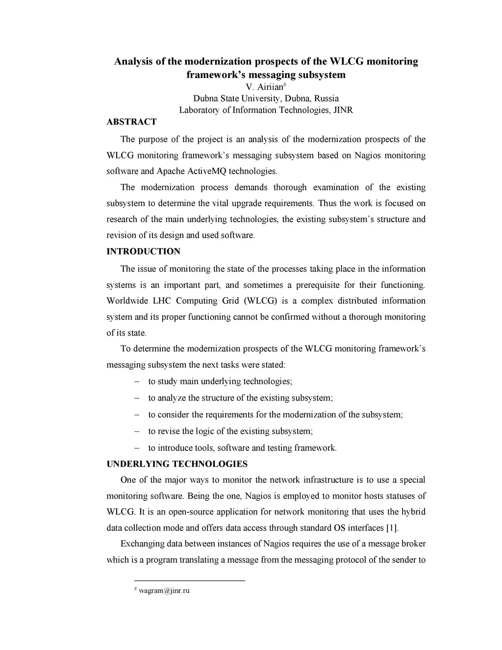 The purpose of the project is an analysis of the modernization prospects of the WLCG monitoring framework's messaging subsystem based on Nagios monitoring software and Apache ActiveMQ technologies. The modernization process demands thorough examination of the existing subsystem to determine the vital upgrade requirements. Thus the work is focused on research of the main underlying technologies, the existing subsystem's structure and revision of its design and used software.