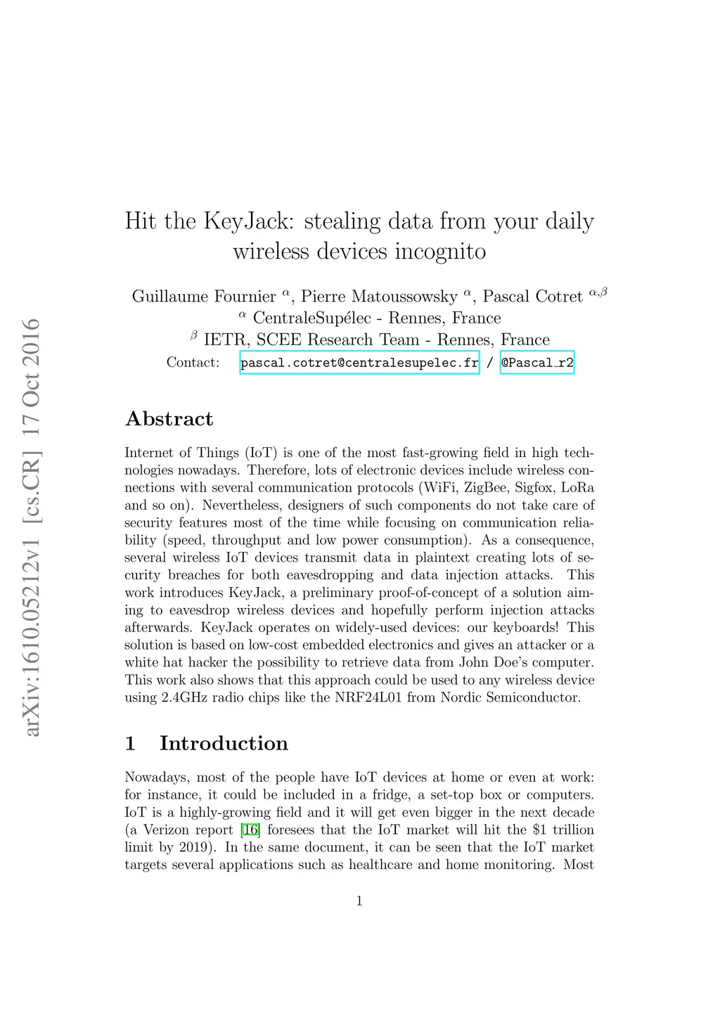 Internet of Things (IoT) is one of the most fast-growing field in high technologies nowadays. Therefore, lots of electronic devices include wireless connections with several communication protocols (WiFi, ZigBee, Sigfox, LoRa and so on). Nevertheless, designers of such components do not take care of security features most of the time while focusing on communication reliability (speed, throughput and low power consumption). As a consequence, several wireless IoT devices transmit data in plaintext creating lots of security breaches for both eavesdropping and data injection attacks. This work introduces KeyJack, a preliminary proof-of-concept of a solution aiming to eavesdrop wireless devices and hopefully perform injection attacks afterwards. KeyJack operates on widely-used devices: our keyboards! This solution is based on low-cost embedded electronics and gives an attacker or a white hat hacker the possibility to retrieve data from John Doe's computer. This work also shows that this approach could be used to any wireless device using 2.4GHz radio chips like the NRF24L01 from Nordic Semiconductor.