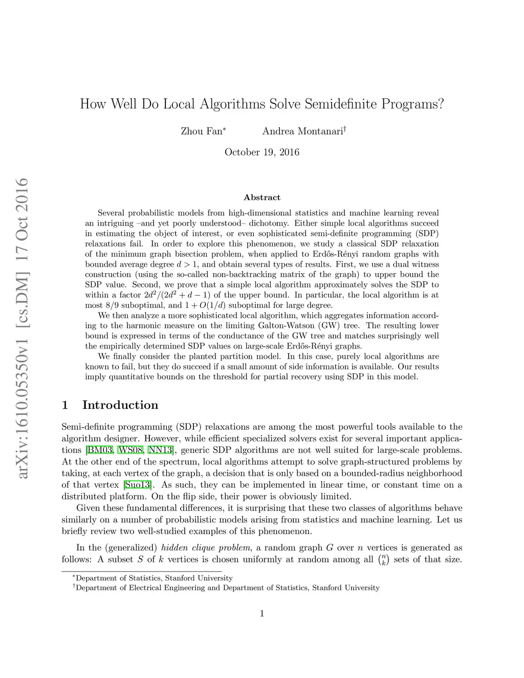 Several probabilistic models from high-dimensional statistics and machine learning reveal an intriguing --and yet poorly understood-- dichotomy. Either simple local algorithms succeed in estimating the object of interest, or even sophisticated semi-definite programming (SDP) relaxations fail. In order to explore this phenomenon, we study a classical SDP relaxation of the minimum graph bisection problem, when applied to Erd\H{o}s-Renyi random graphs with bounded average degree , and obtain several types of results. First, we use a dual witness construction (using the so-called non-backtracking matrix of the graph) to upper bound the SDP value. Second, we prove that a simple local algorithm approximately solves the SDP to within a factor of the upper bound. In particular, the local algorithm is at most suboptimal, and suboptimal for large degree. We then analyze a more sophisticated local algorithm, which aggregates information according to the harmonic measure on the limiting Galton-Watson (GW) tree. The resulting lower bound is expressed in terms of the conductance of the GW tree and matches surprisingly well the empirically determined SDP values on large-scale Erd\H{o}s-Renyi graphs. We finally consider the planted partition model. In this case, purely local algorithms are known to fail, but they do succeed if a small amount of side information is available. Our results imply quantitative bounds on the threshold for partial recovery using SDP in this model.