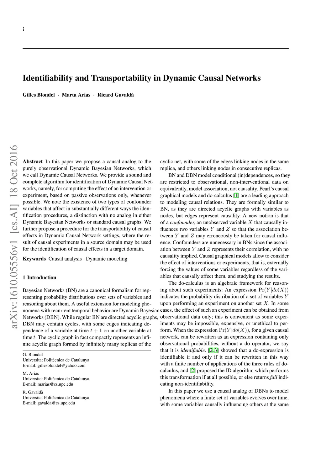 In this paper we propose a causal analog to the purely observational Dynamic Bayesian Networks, which we call Dynamic Causal Networks. We provide a sound and complete algorithm for identification of Dynamic Causal Net- works, namely, for computing the effect of an intervention or experiment, based on passive observations only, whenever possible. We note the existence of two types of confounder variables that affect in substantially different ways the iden- tification procedures, a distinction with no analog in either Dynamic Bayesian Networks or standard causal graphs. We further propose a procedure for the transportability of causal effects in Dynamic Causal Network settings, where the re- sult of causal experiments in a source domain may be used for the identification of causal effects in a target domain.