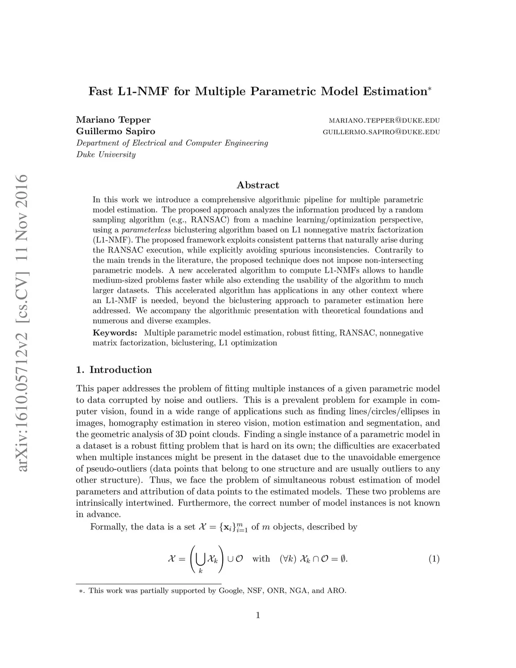 In this work we introduce a comprehensive algorithmic pipeline for multiple parametric model estimation. The proposed approach analyzes the information produced by a random sampling algorithm (e.g., RANSAC) from a machine learning/optimization perspective, using a \textit{parameterless} biclustering algorithm based on L1 nonnegative matrix factorization (L1-NMF). The proposed framework exploits consistent patterns that naturally arise during the RANSAC execution, while explicitly avoiding spurious inconsistencies. Contrarily to the main trends in the literature, the proposed technique does not impose non-intersecting parametric models. A new accelerated algorithm to compute L1-NMFs allows to handle medium-sized problems faster while also extending the usability of the algorithm to much larger datasets. This accelerated algorithm has applications in any other context where an L1-NMF is needed, beyond the biclustering approach to parameter estimation here addressed. We accompany the algorithmic presentation with theoretical foundations and numerous and diverse examples.