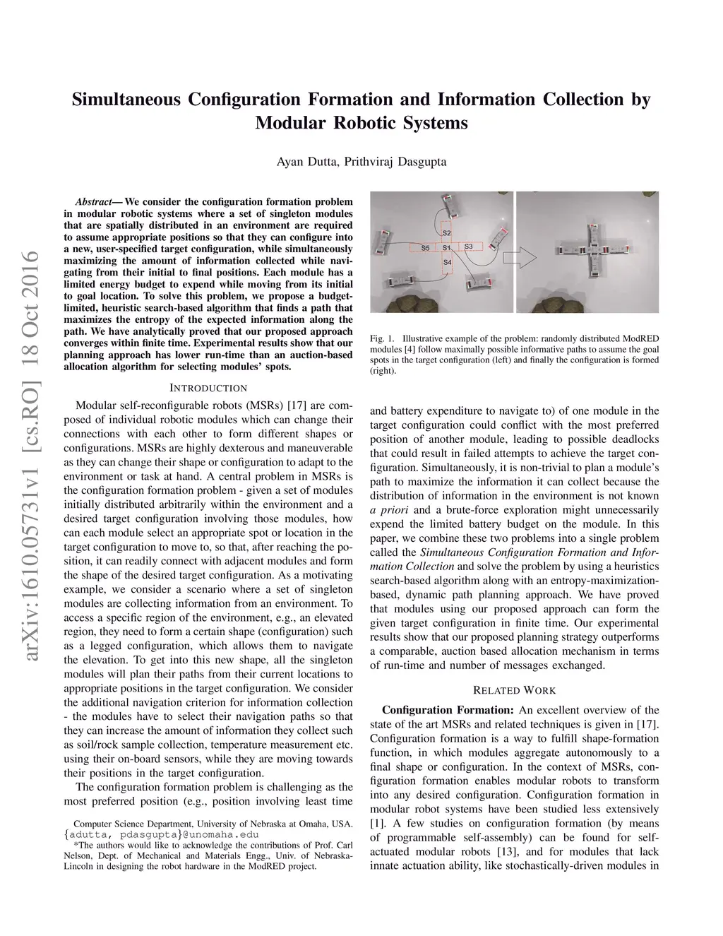 We consider the configuration formation problem in modular robotic systems where a set of singleton modules that are spatially distributed in an environment are required to assume appropriate positions so that they can configure into a new, user-specified target configuration, while simultaneously maximizing the amount of information collected while navigating from their initial to final positions. Each module has a limited energy budget to expend while moving from its initial to goal location. To solve this problem, we propose a budget-limited, heuristic search-based algorithm that finds a path that maximizes the entropy of the expected information along the path. We have analytically proved that our proposed approach converges within finite time. Experimental results show that our planning approach has lower run-time than an auction-based allocation algorithm for selecting modules' spots.