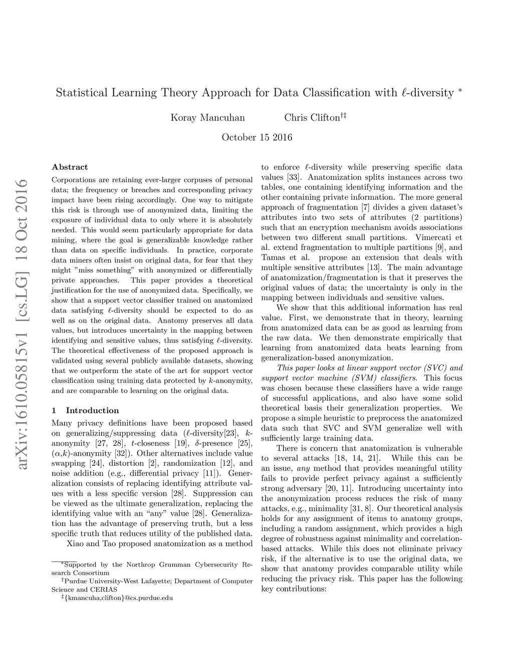 Corporations are retaining ever-larger corpuses of personal data; the frequency or breaches and corresponding privacy impact have been rising accordingly. One way to mitigate this risk is through use of anonymized data, limiting the exposure of individual data to only where it is absolutely needed. This would seem particularly appropriate for data mining, where the goal is generalizable knowledge rather than data on specific individuals. In practice, corporate data miners often insist on original data, for fear that they might "miss something" with anonymized or differentially private approaches. This paper provides a theoretical justification for the use of anonymized data. Specifically, we show that a support vector classifier trained on anatomized data satisfying l-diversity should be expected to do as well as on the original data. Anatomy preserves all data values, but introduces uncertainty in the mapping between identifying and sensitive values, thus satisfying l-diversity. The theoretical effectiveness of the proposed approach is validated using several publicly available datasets, showing that we outperform the state of the art for support vector classification using training data protected by k-anonymity, and are comparable to learning on the original data.
