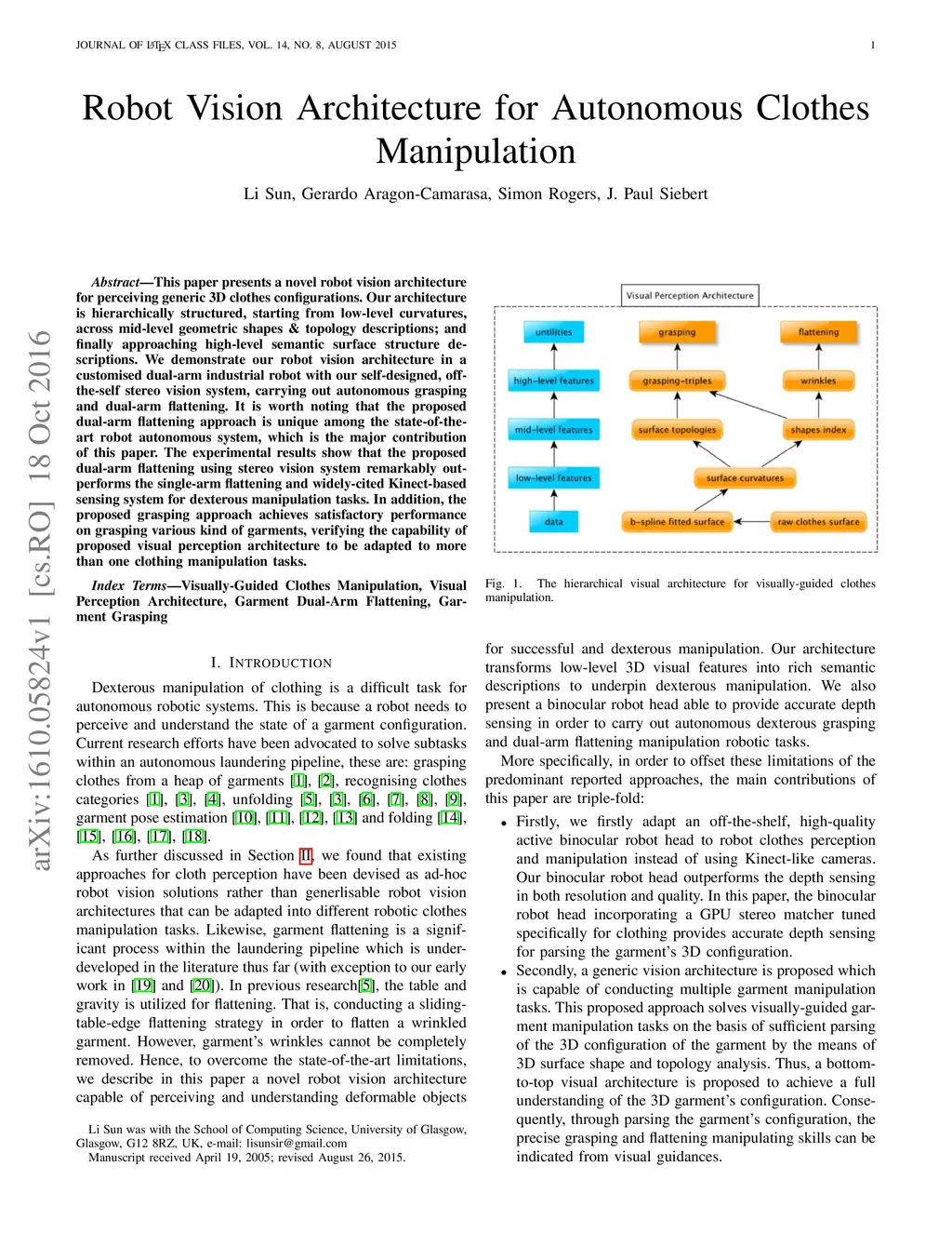 This paper presents a novel robot vision architecture for perceiving generic 3D clothes configurations. Our architecture is hierarchically structured, starting from low-level curvatures, across mid-level geometric shapes \& topology descriptions; and finally approaching high-level semantic surface structure descriptions. We demonstrate our robot vision architecture in a customised dual-arm industrial robot with our self-designed, off-the-self stereo vision system, carrying out autonomous grasping and dual-arm flattening. It is worth noting that the proposed dual-arm flattening approach is unique among the state-of-the-art robot autonomous system, which is the major contribution of this paper. The experimental results show that the proposed dual-arm flattening using stereo vision system remarkably outperforms the single-arm flattening and widely-cited Kinect-based sensing system for dexterous manipulation tasks. In addition, the proposed grasping approach achieves satisfactory performance on grasping various kind of garments, verifying the capability of proposed visual perception architecture to be adapted to more than one clothing manipulation tasks.