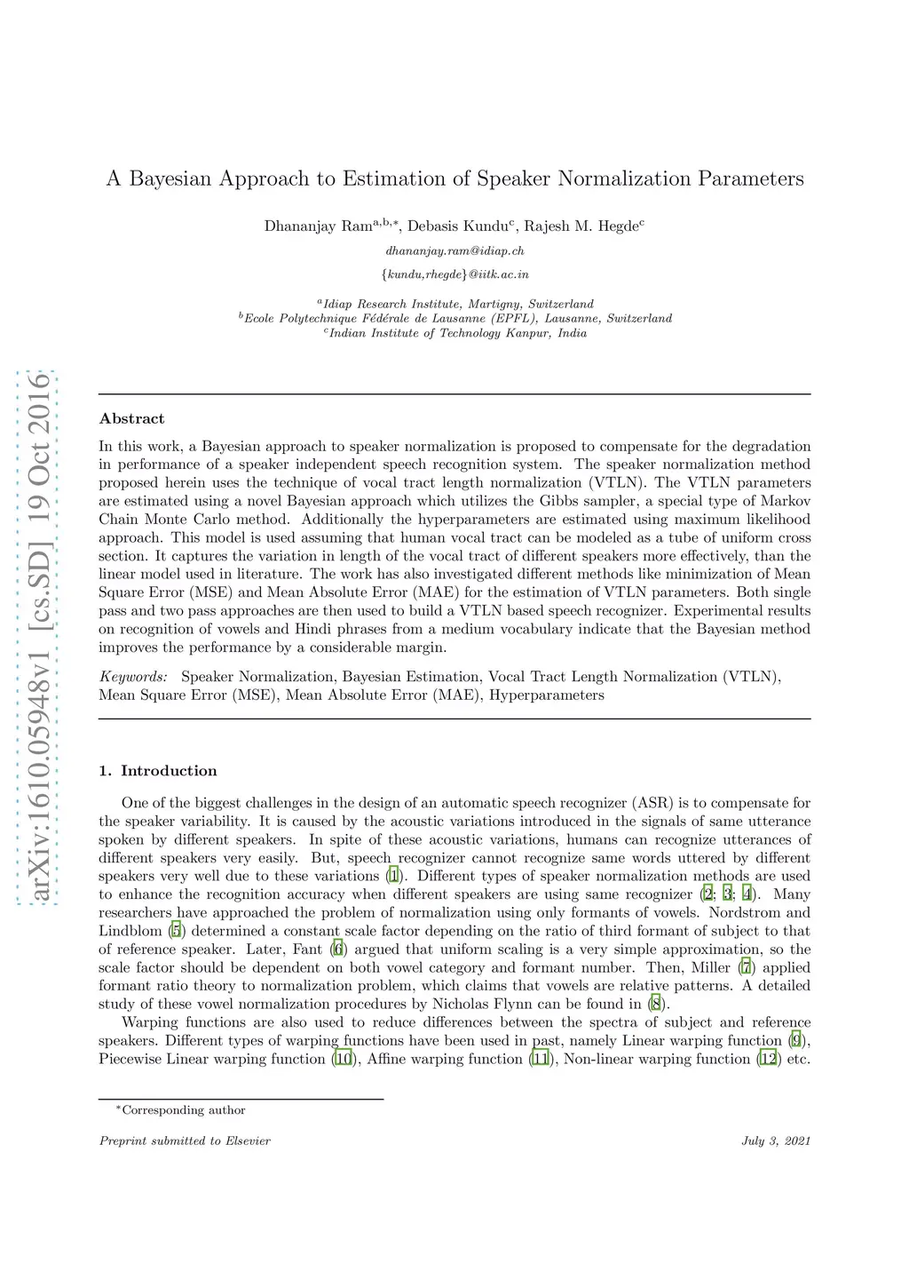 A Bayesian Approach to Estimation of Speaker Normalization Parameters