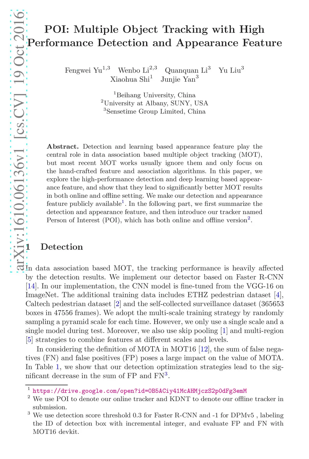 Detection and learning based appearance feature play the central role in data association based multiple object tracking (MOT), but most recent MOT works usually ignore them and only focus on the hand-crafted feature and association algorithms. In this paper, we explore the high-performance detection and deep learning based appearance feature, and show that they lead to significantly better MOT results in both online and offline setting. We make our detection and appearance feature publicly available. In the following part, we first summarize the detection and appearance feature, and then introduce our tracker named Person of Interest (POI), which has both online and offline version.