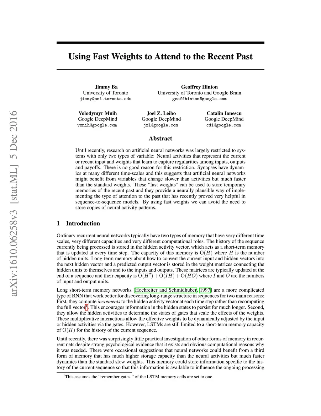 Using Fast Weights to Attend to the Recent Past