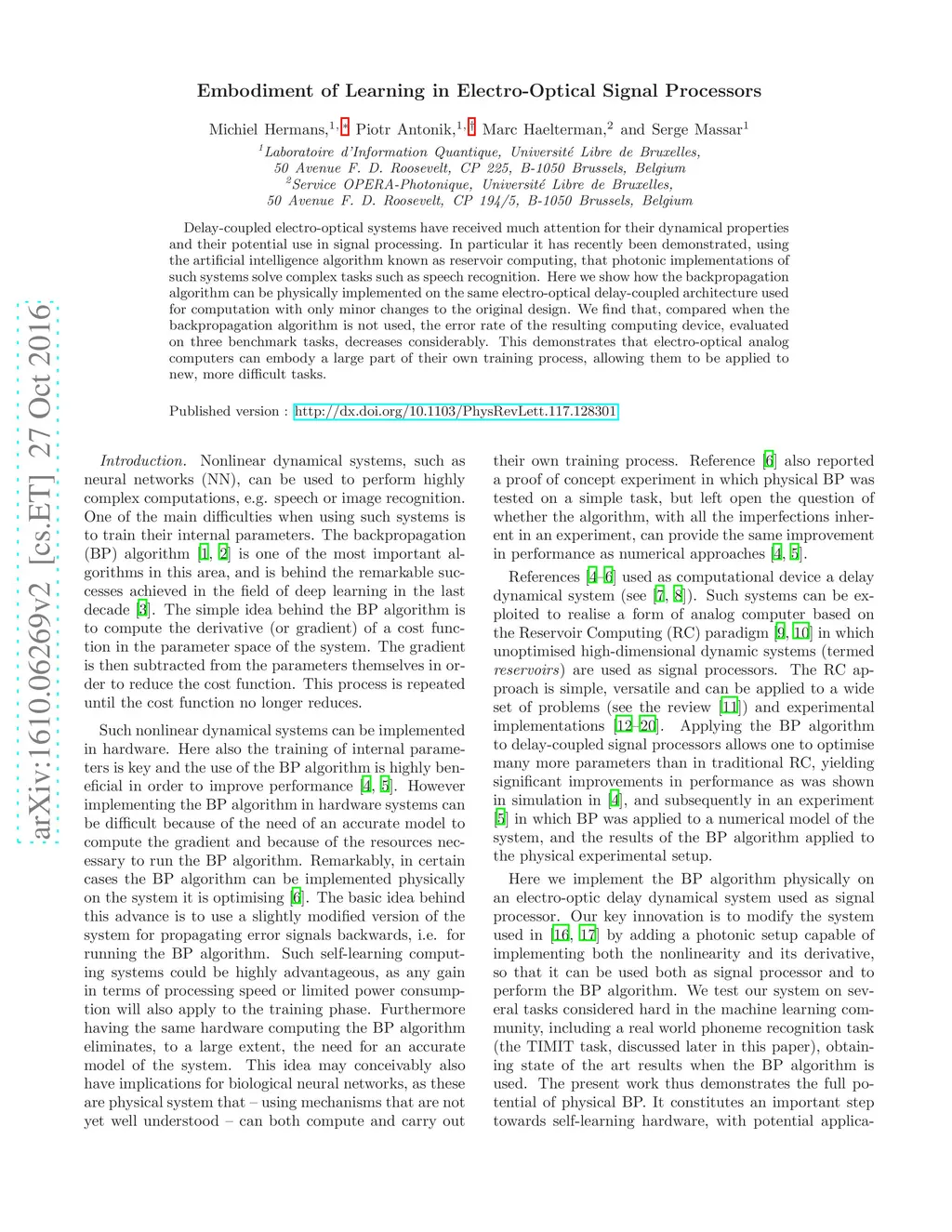 Delay-coupled electro-optical systems have received much attention for their dynamical properties and their potential use in signal processing. In particular it has recently been demonstrated, using the artificial intelligence algorithm known as reservoir computing, that photonic implementations of such systems solve complex tasks such as speech recognition. Here we show how the backpropagation algorithm can be physically implemented on the same electro-optical delay-coupled architecture used for computation with only minor changes to the original design. We find that, compared when the backpropagation algorithm is not used, the error rate of the resulting computing device, evaluated on three benchmark tasks, decreases considerably. This demonstrates that electro-optical analog computers can embody a large part of their own training process, allowing them to be applied to new, more difficult tasks.