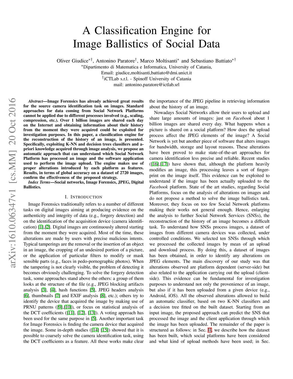 Image Forensics has already achieved great results for the source camera identification task on images. Standard approaches for data coming from Social Network Platforms cannot be applied due to different processes involved (e.g., scaling, compression, etc.). Over 1 billion images are shared each day on the Internet and obtaining information about their history from the moment they were acquired could be exploited for investigation purposes. In this paper, a classification engine for the reconstruction of the history of an image, is presented. Specifically, exploiting K-NN and decision trees classifiers and a-priori knowledge acquired through image analysis, we propose an automatic approach that can understand which Social Network Platform has processed an image and the software application used to perform the image upload. The engine makes use of proper alterations introduced by each platform as features. Results, in terms of global accuracy on a dataset of 2720 images, confirm the effectiveness of the proposed strategy.