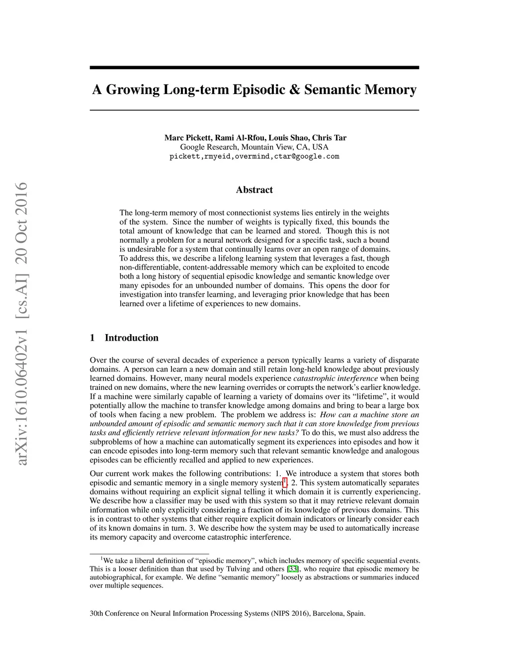 The long-term memory of most connectionist systems lies entirely in the weights of the system. Since the number of weights is typically fixed, this bounds the total amount of knowledge that can be learned and stored. Though this is not normally a problem for a neural network designed for a specific task, such a bound is undesirable for a system that continually learns over an open range of domains. To address this, we describe a lifelong learning system that leverages a fast, though non-differentiable, content-addressable memory which can be exploited to encode both a long history of sequential episodic knowledge and semantic knowledge over many episodes for an unbounded number of domains. This opens the door for investigation into transfer learning, and leveraging prior knowledge that has been learned over a lifetime of experiences to new domains.