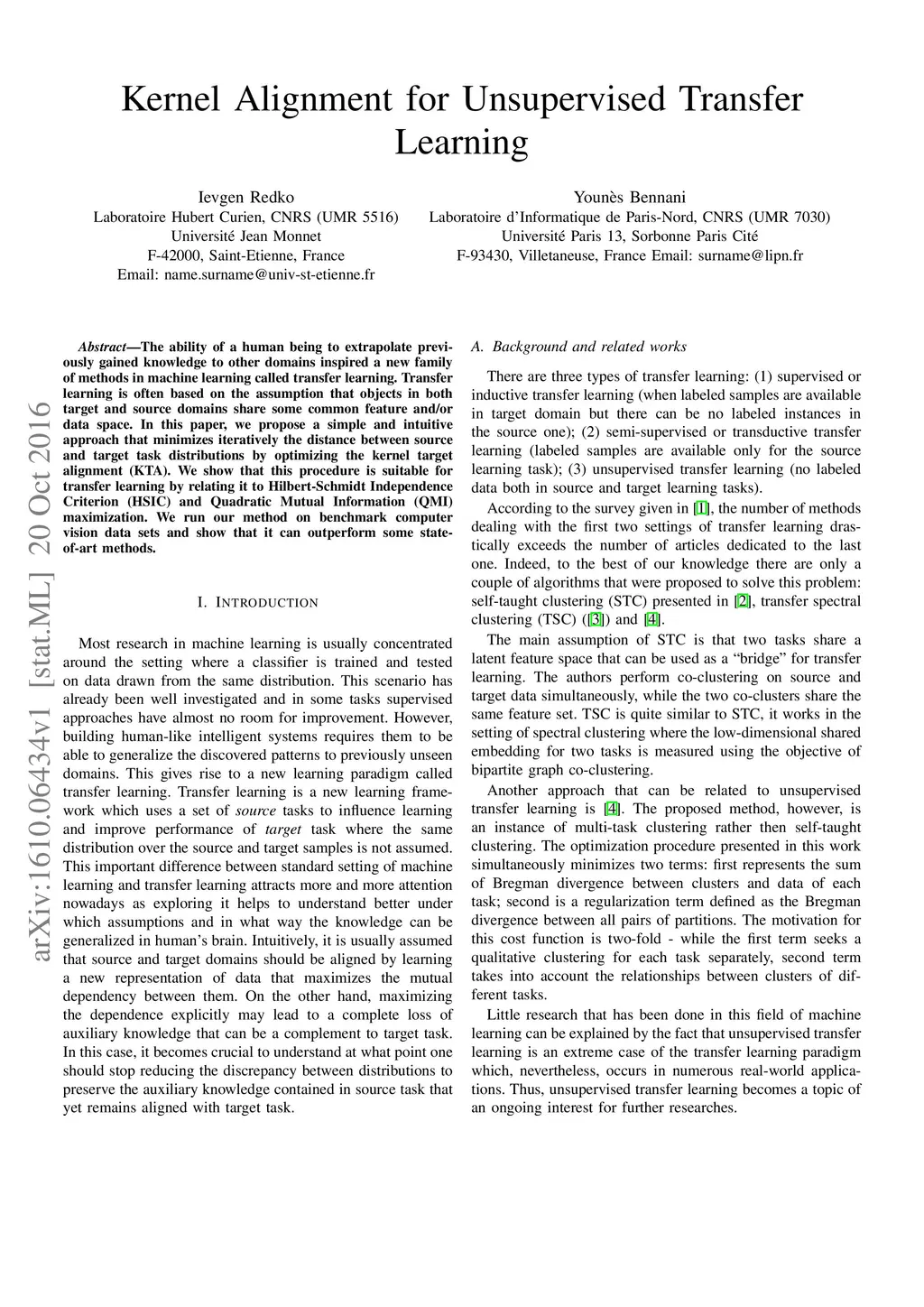 The ability of a human being to extrapolate previously gained knowledge to other domains inspired a new family of methods in machine learning called transfer learning. Transfer learning is often based on the assumption that objects in both target and source domains share some common feature and/or data space. In this paper, we propose a simple and intuitive approach that minimizes iteratively the distance between source and target task distributions by optimizing the kernel target alignment (KTA). We show that this procedure is suitable for transfer learning by relating it to Hilbert-Schmidt Independence Criterion (HSIC) and Quadratic Mutual Information (QMI) maximization. We run our method on benchmark computer vision data sets and show that it can outperform some state-of-art methods.