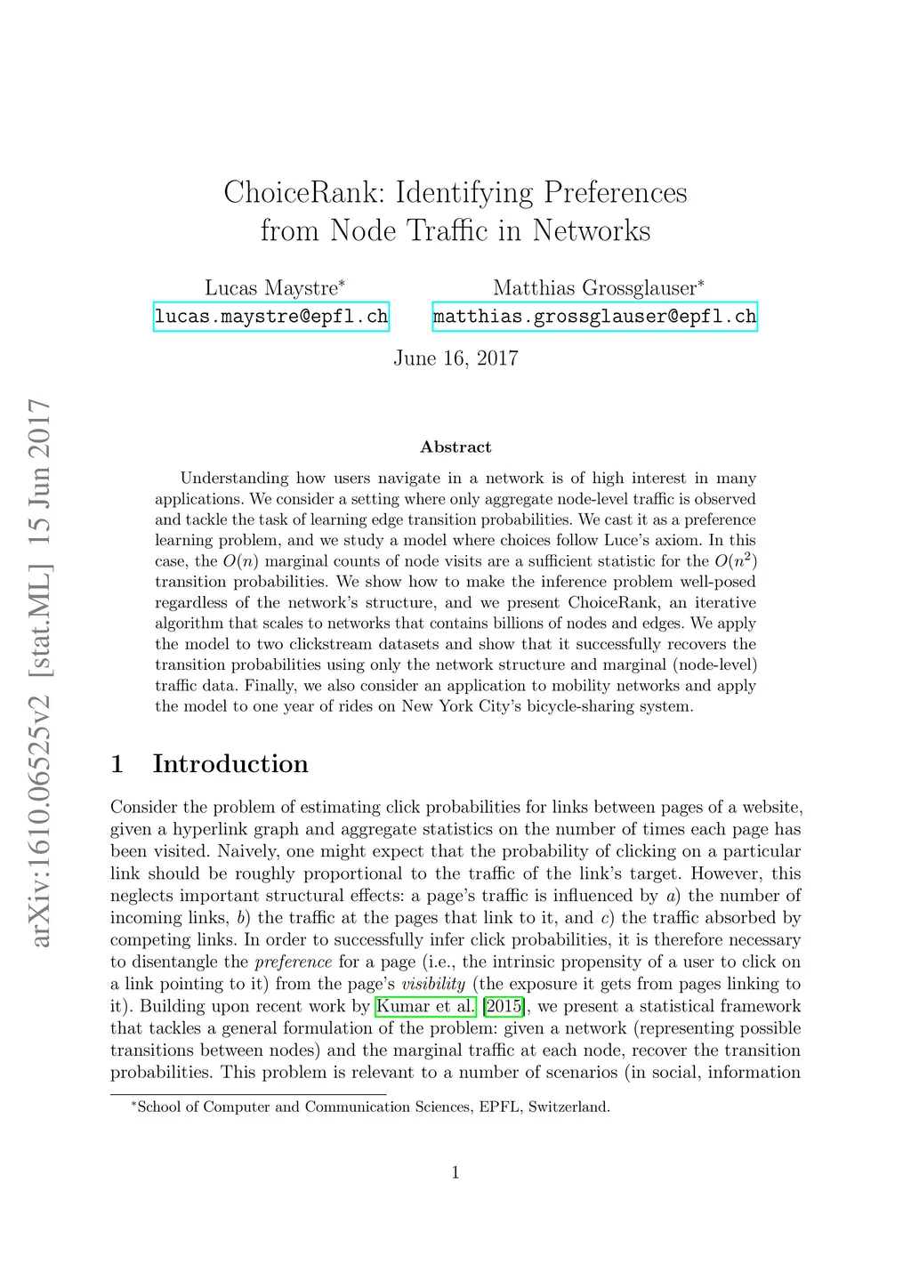 Understanding how users navigate in a network is of high interest in many applications. We consider a setting where only aggregate node-level traffic is observed and tackle the task of learning edge transition probabilities. We cast it as a preference learning problem, and we study a model where choices follow Luce's axiom. In this case, the marginal counts of node visits are a sufficient statistic for the transition probabilities. We show how to make the inference problem well-posed regardless of the network's structure, and we present ChoiceRank, an iterative algorithm that scales to networks that contains billions of nodes and edges. We apply the model to two clickstream datasets and show that it successfully recovers the transition probabilities using only the network structure and marginal (node-level) traffic data. Finally, we also consider an application to mobility networks and apply the model to one year of rides on New York City's bicycle-sharing system.