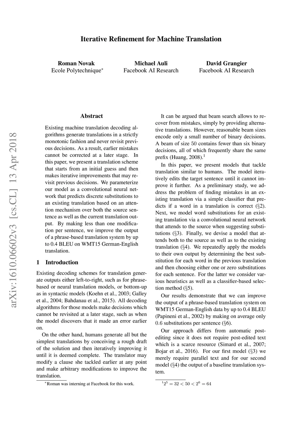Existing machine translation decoding algorithms generate translations in a strictly monotonic fashion and never revisit previous decisions. As a result, earlier mistakes cannot be corrected at a later stage. In this paper, we present a translation scheme that starts from an initial guess and then makes iterative improvements that may revisit previous decisions. We parameterize our model as a convolutional neural network that predicts discrete substitutions to an existing translation based on an attention mechanism over both the source sentence as well as the current translation output. By making less than one modification per sentence, we improve the output of a phrase-based translation system by up to 0.4 BLEU on WMT15 German-English translation.
