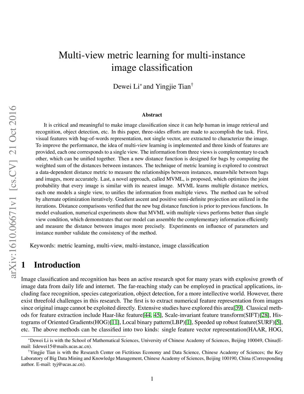 It is critical and meaningful to make image classification since it can help human in image retrieval and recognition, object detection, etc. In this paper, three-sides efforts are made to accomplish the task. First, visual features with bag-of-words representation, not single vector, are extracted to characterize the image. To improve the performance, the idea of multi-view learning is implemented and three kinds of features are provided, each one corresponds to a single view. The information from three views is complementary to each other, which can be unified together. Then a new distance function is designed for bags by computing the weighted sum of the distances between instances. The technique of metric learning is explored to construct a data-dependent distance metric to measure the relationships between instances, meanwhile between bags and images, more accurately. Last, a novel approach, called MVML, is proposed, which optimizes the joint probability that every image is similar with its nearest image. MVML learns multiple distance metrics, each one models a single view, to unifies the information from multiple views. The method can be solved by alternate optimization iteratively. Gradient ascent and positive semi-definite projection are utilized in the iterations. Distance comparisons verified that the new bag distance function is prior to previous functions. In model evaluation, numerical experiments show that MVML with multiple views performs better than single view condition, which demonstrates that our model can assemble the complementary information efficiently and measure the distance between images more precisely. Experiments on influence of parameters and instance number validate the consistency of the method.