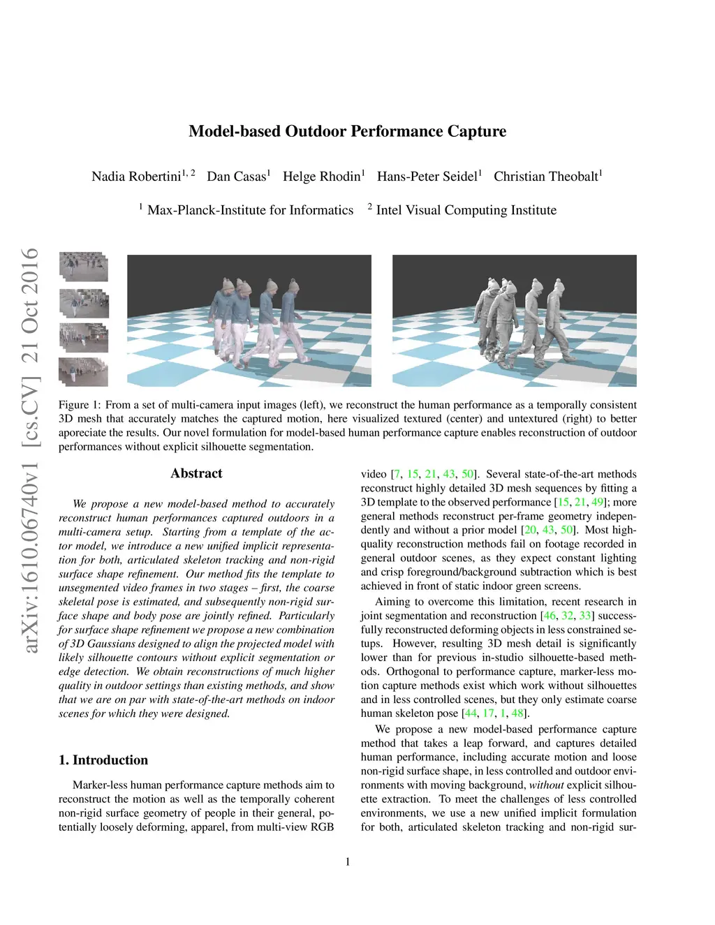 We propose a new model-based method to accurately reconstruct human performances captured outdoors in a multi-camera setup. Starting from a template of the actor model, we introduce a new unified implicit representation for both, articulated skeleton tracking and nonrigid surface shape refinement. Our method fits the template to unsegmented video frames in two stages - first, the coarse skeletal pose is estimated, and subsequently non-rigid surface shape and body pose are jointly refined. Particularly for surface shape refinement we propose a new combination of 3D Gaussians designed to align the projected model with likely silhouette contours without explicit segmentation or edge detection. We obtain reconstructions of much higher quality in outdoor settings than existing methods, and show that we are on par with state-of-the-art methods on indoor scenes for which they were designed