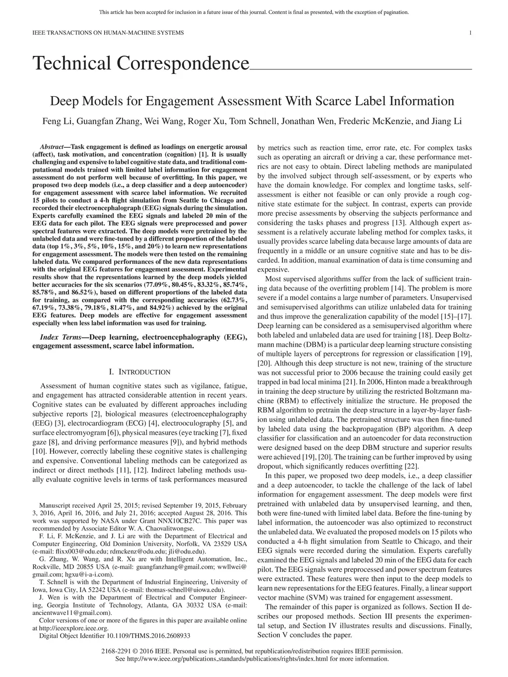 Task engagement is defined as loadings on energetic arousal (affect), task motivation, and concentration (cognition). It is usually challenging and expensive to label cognitive state data, and traditional computational models trained with limited label information for engagement assessment do not perform well because of overfitting. In this paper, we proposed two deep models (i.e., a deep classifier and a deep autoencoder) for engagement assessment with scarce label information. We recruited 15 pilots to conduct a 4-h flight simulation from Seattle to Chicago and recorded their electroencephalograph (EEG) signals during the simulation. Experts carefully examined the EEG signals and labeled 20 min of the EEG data for each pilot. The EEG signals were preprocessed and power spectral features were extracted. The deep models were pretrained by the unlabeled data and were fine-tuned by a different proportion of the labeled data (top 1%, 3%, 5%, 10%, 15%, and 20%) to learn new representations for engagement assessment. The models were then tested on the remaining labeled data. We compared performances of the new data representations with the original EEG features for engagement assessment. Experimental results show that the representations learned by the deep models yielded better accuracies for the six scenarios (77.09%, 80.45%, 83.32%, 85.74%, 85.78%, and 86.52%), based on different proportions of the labeled data for training, as compared with the corresponding accuracies (62.73%, 67.19%, 73.38%, 79.18%, 81.47%, and 84.92%) achieved by the original EEG features. Deep models are effective for engagement assessment especially when less label information was used for training.