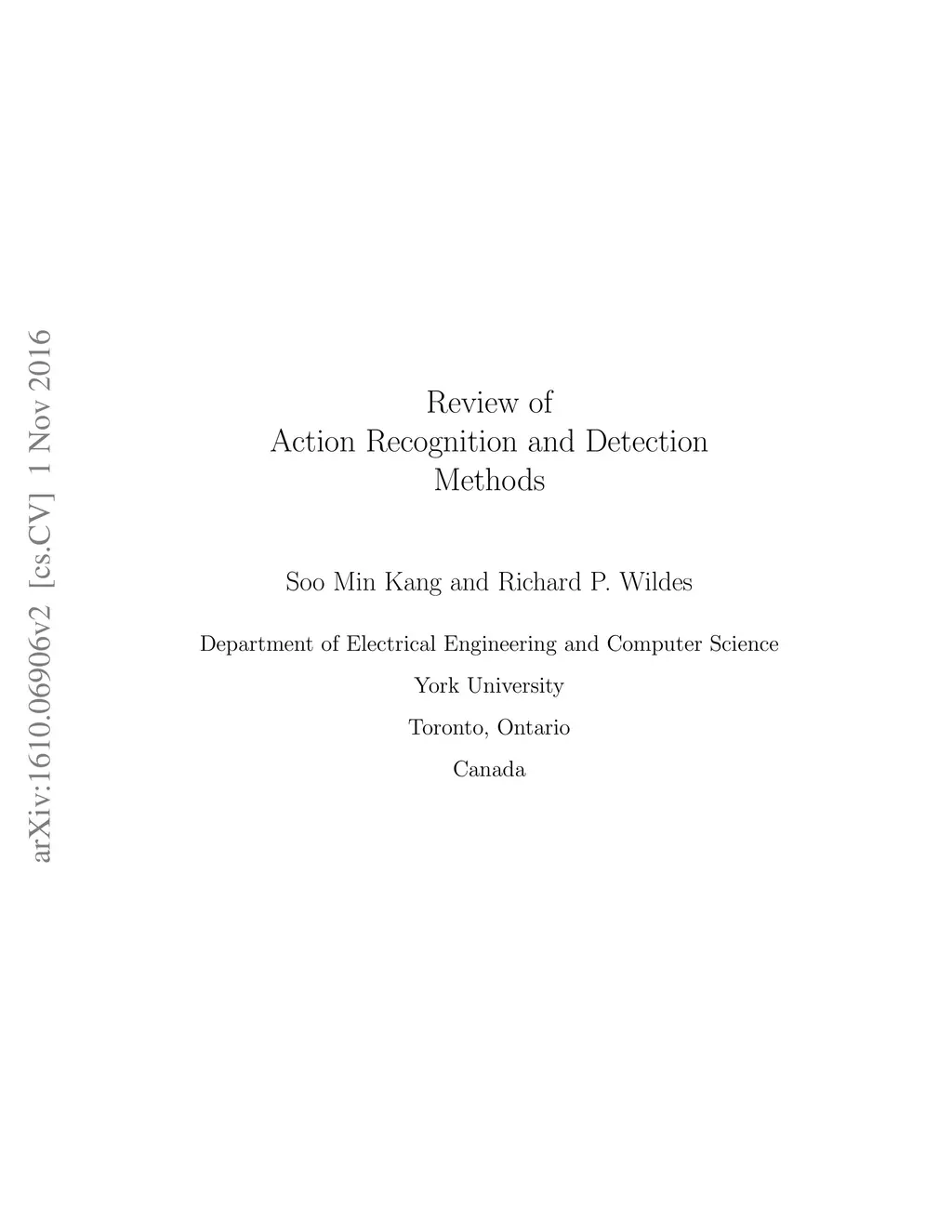 In computer vision, action recognition refers to the act of classifying an action that is present in a given video and action detection involves locating actions of interest in space and/or time. Videos, which contain photometric information (e.g. RGB, intensity values) in a lattice structure, contain information that can assist in identifying the action that has been imaged. The process of action recognition and detection often begins with extracting useful features and encoding them to ensure that the features are specific to serve the task of action recognition and detection. Encoded features are then processed through a classifier to identify the action class and their spatial and/or temporal locations. In this report, a thorough review of various action recognition and detection algorithms in computer vision is provided by analyzing the two-step process of a typical action recognition and detection algorithm: (i) extraction and encoding of features, and (ii) classifying features into action classes. In efforts to ensure that computer vision-based algorithms reach the capabilities that humans have of identifying actions irrespective of various nuisance variables that may be present within the field of view, the state-of-the-art methods are reviewed and some remaining problems are addressed in the final chapter.