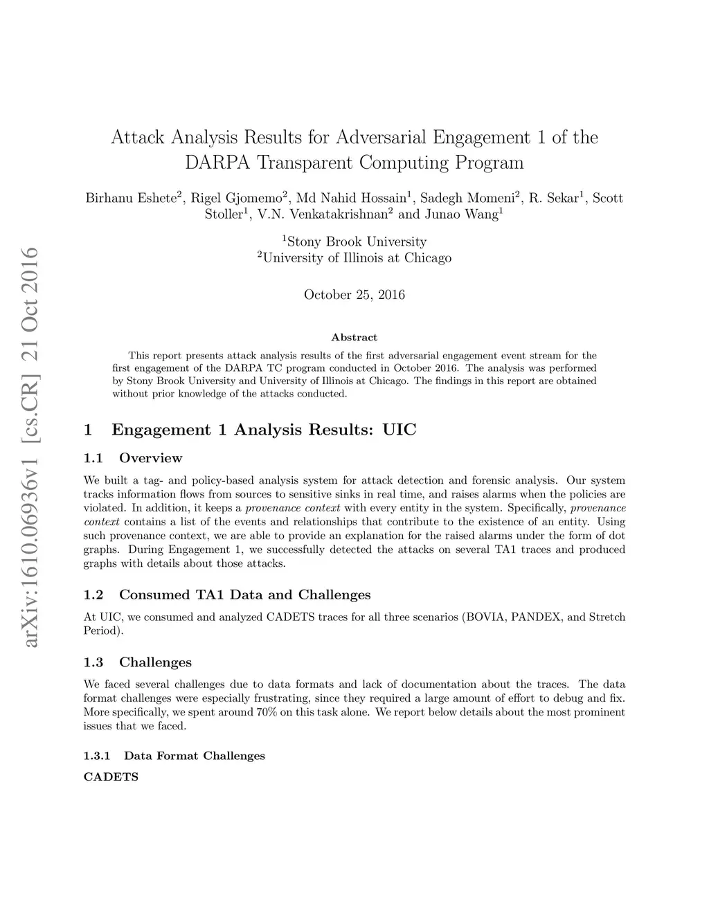 This report presents attack analysis results of the first adversarial engagement event stream for the first engagement of the DARPA TC program conducted in October 2016. The analysis was performed by Stony Brook University and University of Illinois at Chicago. The findings in this report are obtained without prior knowledge of the attacks conducted.