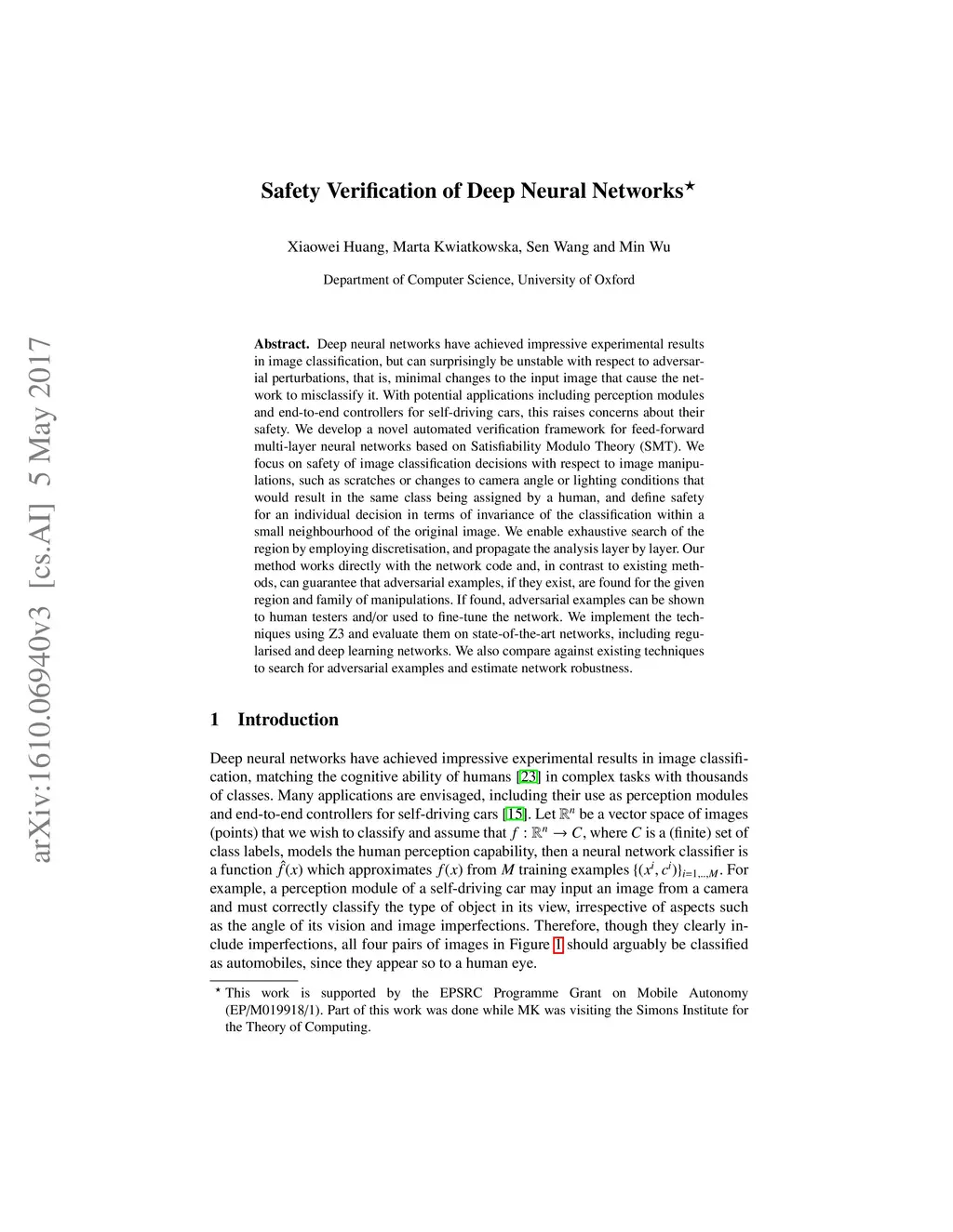 Deep neural networks have achieved impressive experimental results in image classification, but can surprisingly be unstable with respect to adversarial perturbations, that is, minimal changes to the input image that cause the network to misclassify it. With potential applications including perception modules and end-to-end controllers for self-driving cars, this raises concerns about their safety. We develop a novel automated verification framework for feed-forward multi-layer neural networks based on Satisfiability Modulo Theory (SMT). We focus on safety of image classification decisions with respect to image manipulations, such as scratches or changes to camera angle or lighting conditions that would result in the same class being assigned by a human, and define safety for an individual decision in terms of invariance of the classification within a small neighbourhood of the original image. We enable exhaustive search of the region by employing discretisation, and propagate the analysis layer by layer. Our method works directly with the network code and, in contrast to existing methods, can guarantee that adversarial examples, if they exist, are found for the given region and family of manipulations. If found, adversarial examples can be shown to human testers and/or used to fine-tune the network. We implement the techniques using Z3 and evaluate them on state-of-the-art networks, including regularised and deep learning networks. We also compare against existing techniques to search for adversarial examples and estimate network robustness.