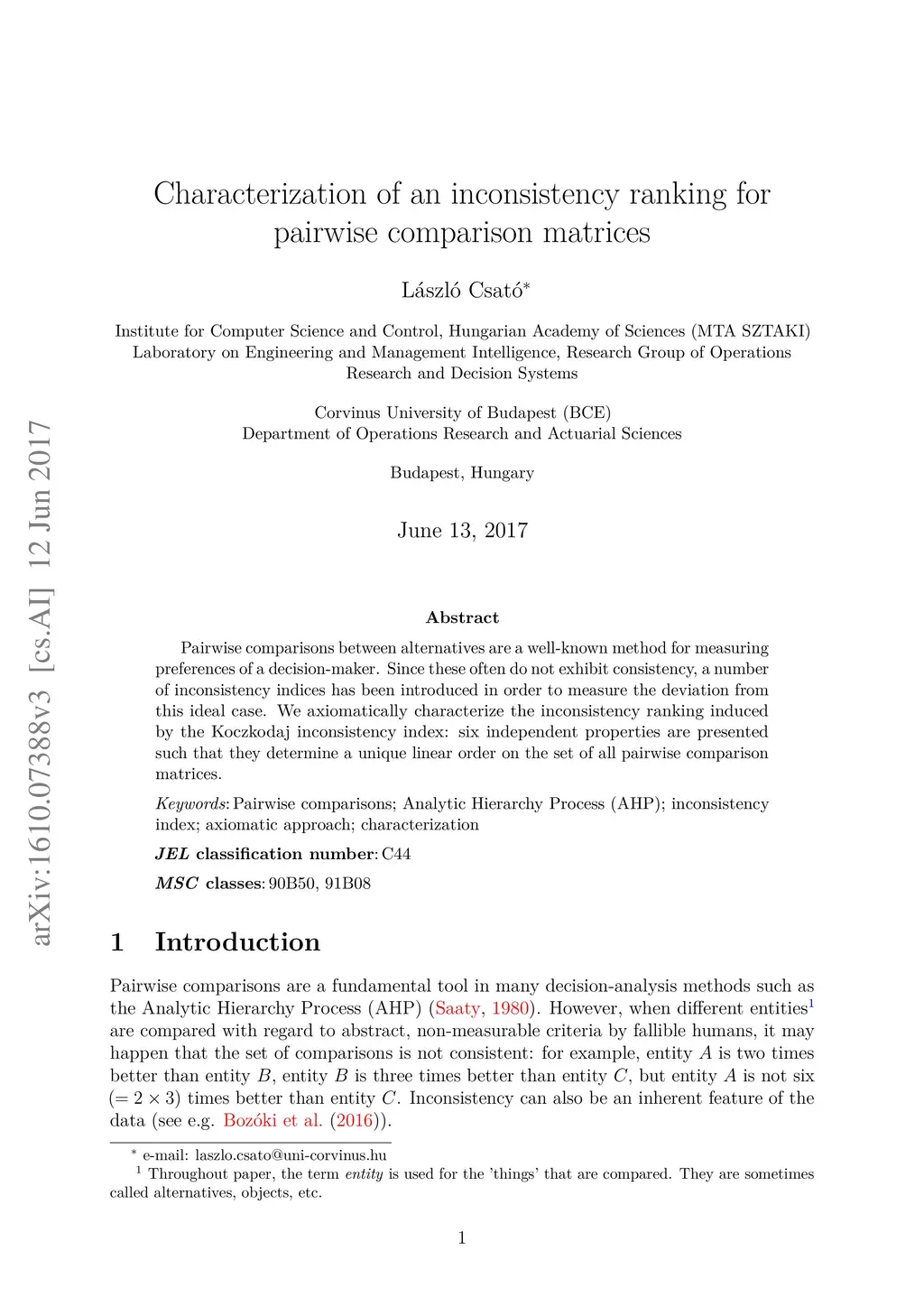 Pairwise comparisons between alternatives are a well-known method for measuring preferences of a decision-maker. Since these often do not exhibit consistency, a number of inconsistency indices has been introduced in order to measure the deviation from this ideal case. We axiomatically characterize the inconsistency ranking induced by the Koczkodaj inconsistency index: six independent properties are presented such that they determine a unique linear order on the set of all pairwise comparison matrices.