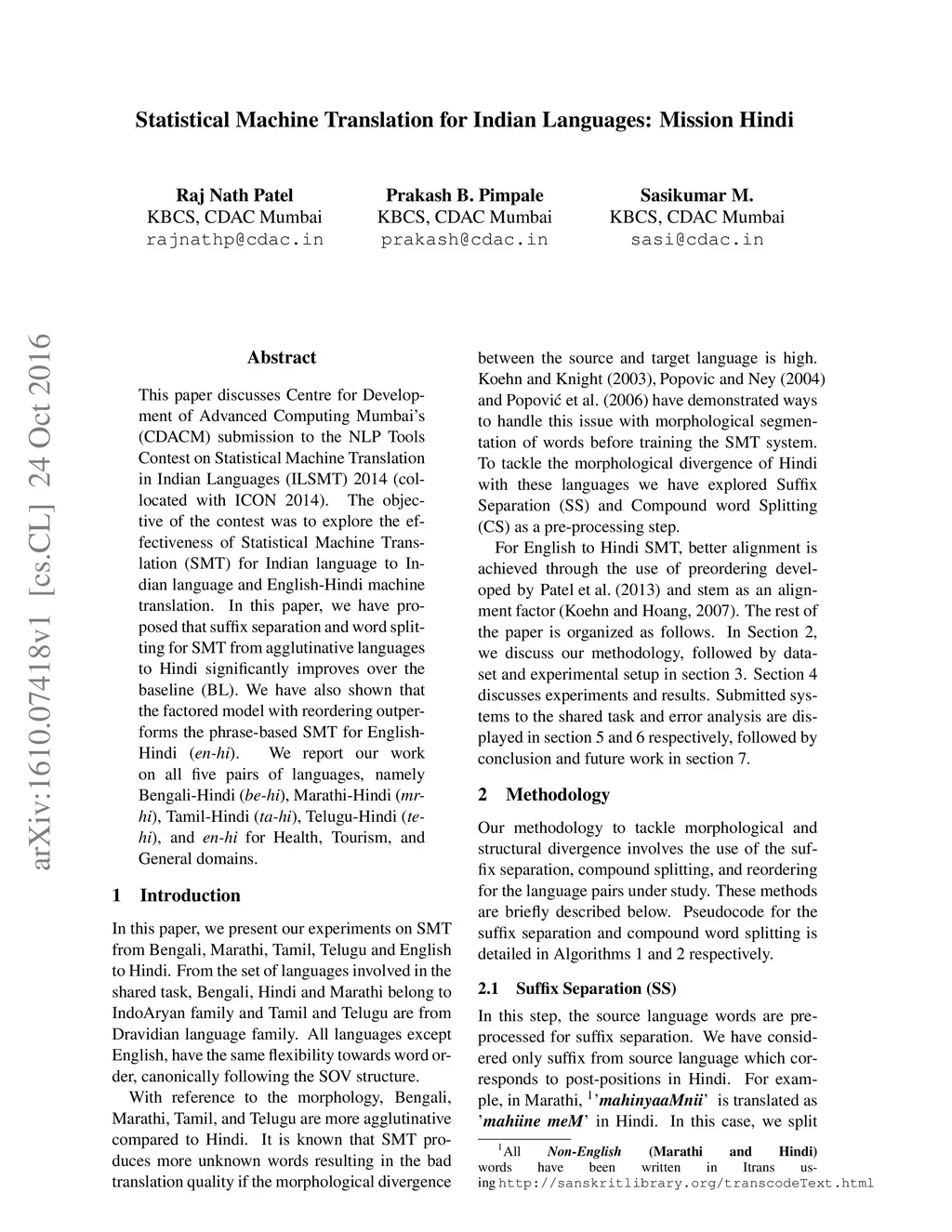 This paper discusses Centre for Development of Advanced Computing Mumbai's (CDACM) submission to the NLP Tools Contest on Statistical Machine Translation in Indian Languages (ILSMT) 2014 (collocated with ICON 2014). The objective of the contest was to explore the effectiveness of Statistical Machine Translation (SMT) for Indian language to Indian language and English-Hindi machine translation. In this paper, we have proposed that suffix separation and word splitting for SMT from agglutinative languages to Hindi significantly improves over the baseline (BL). We have also shown that the factored model with reordering outperforms the phrase-based SMT for English-Hindi (\enhi). We report our work on all five pairs of languages, namely Bengali-Hindi (\bnhi), Marathi-Hindi (\mrhi), Tamil-Hindi (\tahi), Telugu-Hindi (\tehi), and \enhi for Health, Tourism, and General domains.