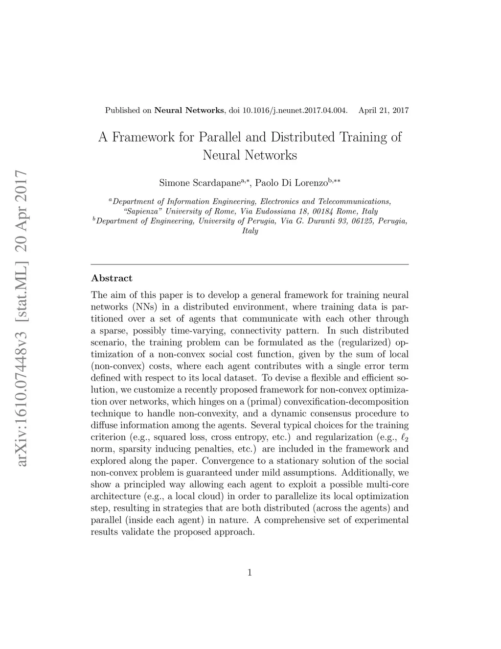 The aim of this paper is to develop a general framework for training neural networks (NNs) in a distributed environment, where training data is partitioned over a set of agents that communicate with each other through a sparse, possibly time-varying, connectivity pattern. In such distributed scenario, the training problem can be formulated as the (regularized) optimization of a non-convex social cost function, given by the sum of local (non-convex) costs, where each agent contributes with a single error term defined with respect to its local dataset. To devise a flexible and efficient solution, we customize a recently proposed framework for non-convex optimization over networks, which hinges on a (primal) convexification-decomposition technique to handle non-convexity, and a dynamic consensus procedure to diffuse information among the agents. Several typical choices for the training criterion (e.g., squared loss, cross entropy, etc.) and regularization (e.g., norm, sparsity inducing penalties, etc.) are included in the framework and explored along the paper. Convergence to a stationary solution of the social non-convex problem is guaranteed under mild assumptions. Additionally, we show a principled way allowing each agent to exploit a possible multi-core architecture (e.g., a local cloud) in order to parallelize its local optimization step, resulting in strategies that are both distributed (across the agents) and parallel (inside each agent) in nature. A comprehensive set of experimental results validate the proposed approach.