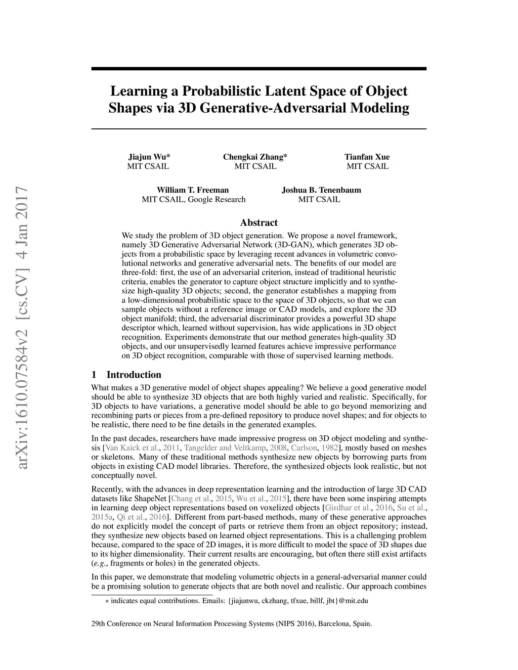 We study the problem of 3D object generation. We propose a novel framework, namely 3D Generative Adversarial Network (3D-GAN), which generates 3D objects from a probabilistic space by leveraging recent advances in volumetric convolutional networks and generative adversarial nets. The benefits of our model are three-fold: first, the use of an adversarial criterion, instead of traditional heuristic criteria, enables the generator to capture object structure implicitly and to synthesize high-quality 3D objects; second, the generator establishes a mapping from a low-dimensional probabilistic space to the space of 3D objects, so that we can sample objects without a reference image or CAD models, and explore the 3D object manifold; third, the adversarial discriminator provides a powerful 3D shape descriptor which, learned without supervision, has wide applications in 3D object recognition. Experiments demonstrate that our method generates high-quality 3D objects, and our unsupervisedly learned features achieve impressive performance on 3D object recognition, comparable with those of supervised learning methods.