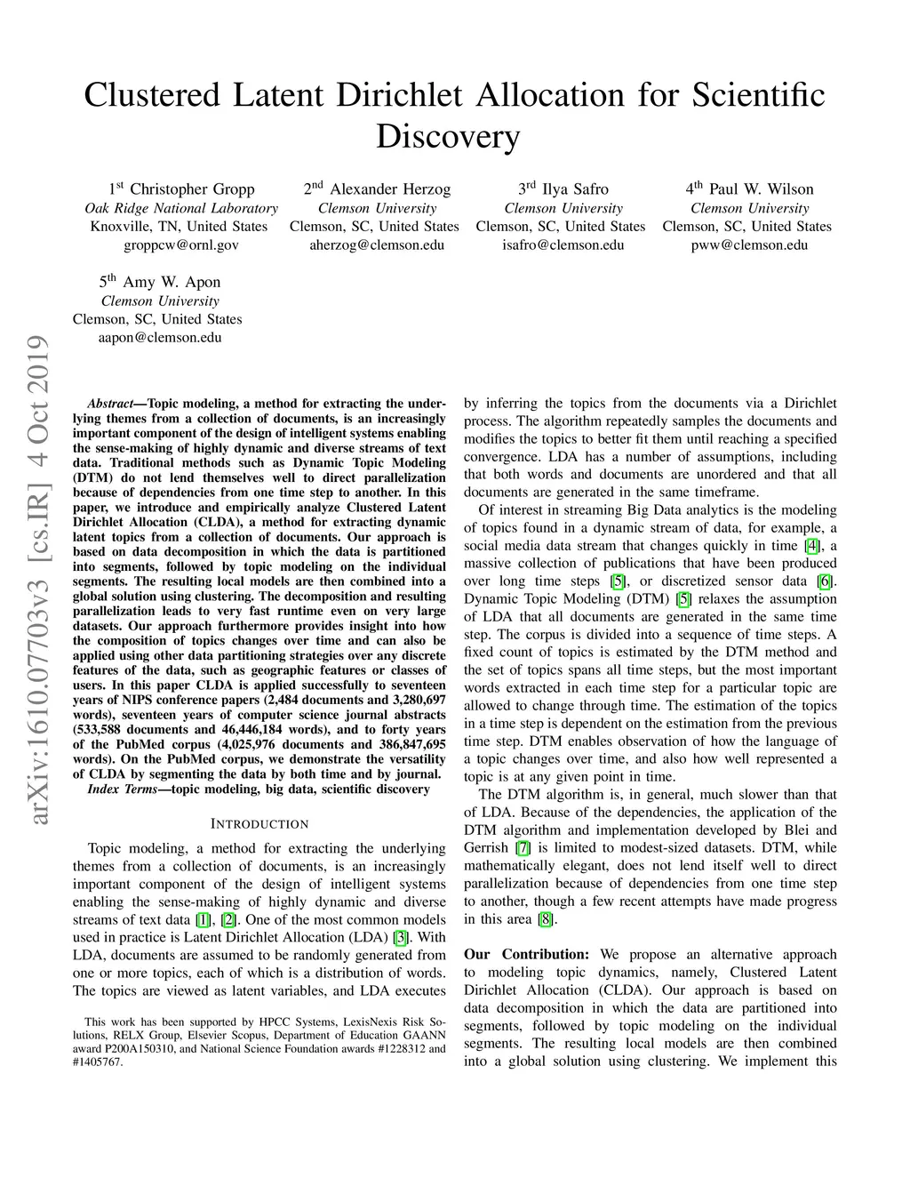 Topic modeling, a method for extracting the underlying themes from a collection of documents, is an increasingly important component of the design of intelligent systems enabling the sense-making of highly dynamic and diverse streams of text data. Traditional methods such as Dynamic Topic Modeling (DTM) do not lend themselves well to direct parallelization because of dependencies from one time step to another. In this paper, we introduce and empirically analyze Clustered Latent Dirichlet Allocation (CLDA), a method for extracting dynamic latent topics from a collection of documents. Our approach is based on data decomposition in which the data is partitioned into segments, followed by topic modeling on the individual segments. The resulting local models are then combined into a global solution using clustering. The decomposition and resulting parallelization leads to very fast runtime even on very large datasets. Our approach furthermore provides insight into how the composition of topics changes over time and can also be applied using other data partitioning strategies over any discrete features of the data, such as geographic features or classes of users. In this paper CLDA is applied successfully to seventeen years of NIPS conference papers (2,484 documents and 3,280,697 words), seventeen years of computer science journal abstracts (533,560 documents and 32,551,540 words), and to forty years of the PubMed corpus (4,025,978 documents and 273,853,980 words).
