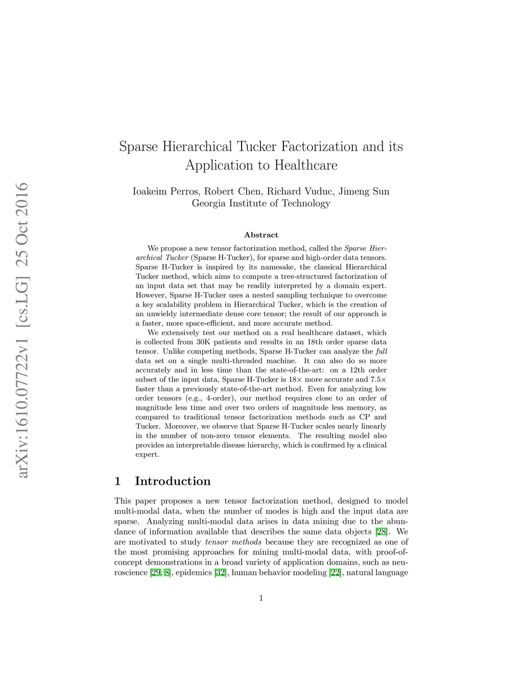 We propose a new tensor factorization method, called the Sparse Hierarchical-Tucker (Sparse H-Tucker), for sparse and high-order data tensors. Sparse H-Tucker is inspired by its namesake, the classical Hierarchical Tucker method, which aims to compute a tree-structured factorization of an input data set that may be readily interpreted by a domain expert. However, Sparse H-Tucker uses a nested sampling technique to overcome a key scalability problem in Hierarchical Tucker, which is the creation of an unwieldy intermediate dense core tensor; the result of our approach is a faster, more space-efficient, and more accurate method. We extensively test our method on a real healthcare dataset, which is collected from 30K patients and results in an 18th order sparse data tensor. Unlike competing methods, Sparse H-Tucker can analyze the full data set on a single multi-threaded machine. It can also do so more accurately and in less time than the state-of-the-art: on a 12th order subset of the input data, Sparse H-Tucker is 18x more accurate and 7.5x faster than a previously state-of-the-art method. Even for analyzing low order tensors (e.g., 4-order), our method requires close to an order of magnitude less time and over two orders of magnitude less memory, as compared to traditional tensor factorization methods such as CP and Tucker. Moreover, we observe that Sparse H-Tucker scales nearly linearly in the number of non-zero tensor elements. The resulting model also provides an interpretable disease hierarchy, which is confirmed by a clinical expert.