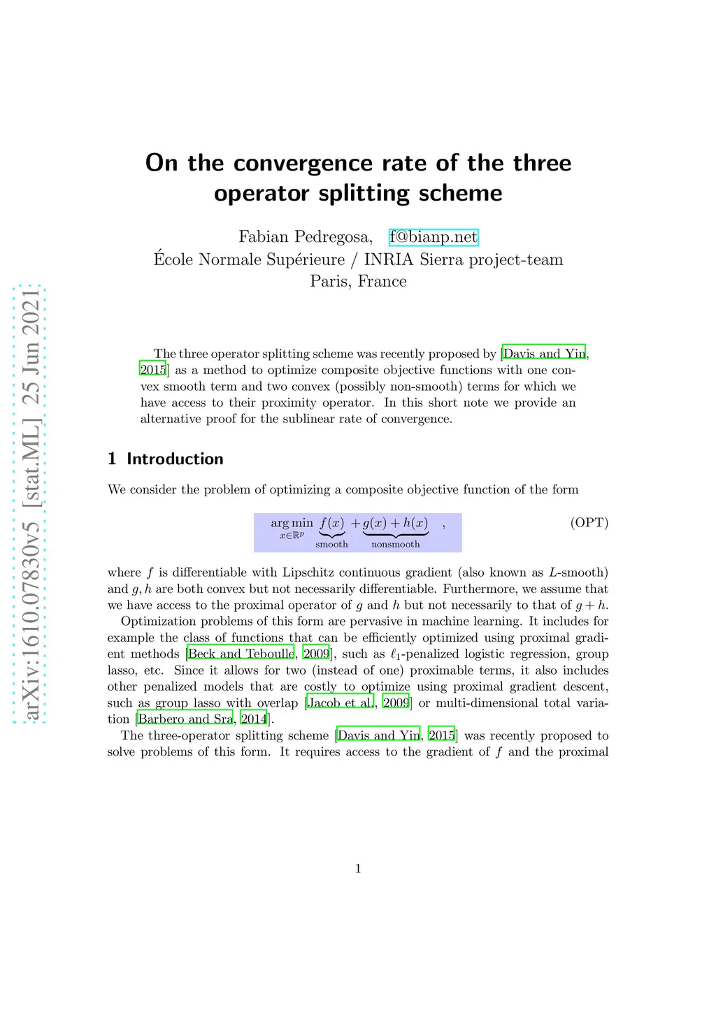 The three operator splitting scheme was recently proposed by [Davis and Yin, 2015] as a method to optimize composite objective functions with one convex smooth term and two convex (possibly non-smooth) terms for which we have access to their proximity operator. In this short note we provide an alternative proof for the sublinear rate of convergence of this method.