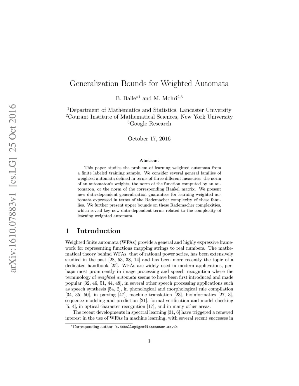 This paper studies the problem of learning weighted automata from a finite labeled training sample. We consider several general families of weighted automata defined in terms of three different measures: the norm of an automaton's weights, the norm of the function computed by an automaton, or the norm of the corresponding Hankel matrix. We present new data-dependent generalization guarantees for learning weighted automata expressed in terms of the Rademacher complexity of these families. We further present upper bounds on these Rademacher complexities, which reveal key new data-dependent terms related to the complexity of learning weighted automata.