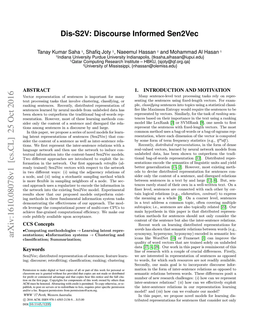 Dis-S2V: Discourse Informed Sen2Vec