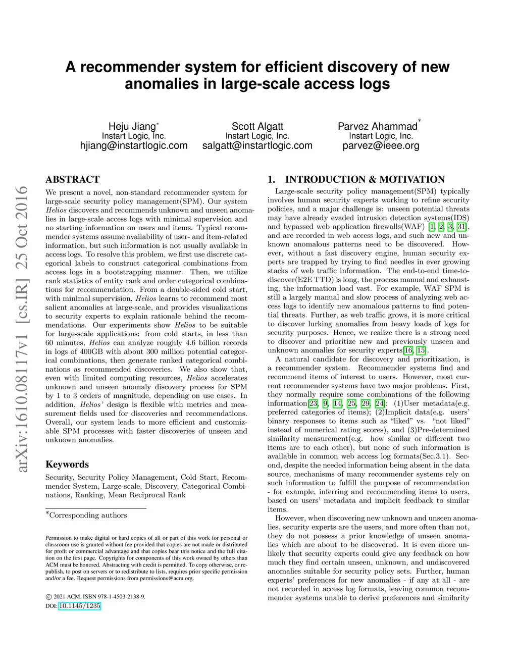 We present a novel, non-standard recommender system for large-scale security policy management(SPM). Our system Helios discovers and recommends unknown and unseen anomalies in large-scale access logs with minimal supervision and no starting information on users and items. Typical recommender systems assume availability of user- and item-related information, but such information is not usually available in access logs. To resolve this problem, we first use discrete categorical labels to construct categorical combinations from access logs in a bootstrapping manner. Then, we utilize rank statistics of entity rank and order categorical combinations for recommendation. From a double-sided cold start, with minimal supervision, Helios learns to recommend most salient anomalies at large-scale, and provides visualizations to security experts to explain rationale behind the recommendations. Our experiments show Helios to be suitable for large-scale applications: from cold starts, in less than 60 minutes, Helios can analyze roughly 4.6 billion records in logs of 400GB with about 300 million potential categorical combinations, then generate ranked categorical combinations as recommended discoveries. We also show that, even with limited computing resources, Helios accelerates unknown and unseen anomaly discovery process for SPM by 1 to 3 orders of magnitude, depending on use cases. In addition, Helios' design is flexible with metrics and measurement fields used for discoveries and recommendations. Overall, our system leads to more efficient and customizable SPM processes with faster discoveries of unseen and unknown anomalies.