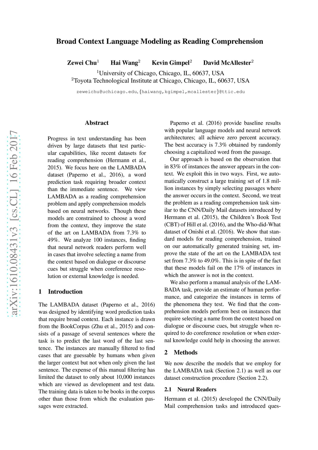 Progress in text understanding has been driven by large datasets that test particular capabilities, like recent datasets for reading comprehension (Hermann et al., 2015). We focus here on the LAMBADA dataset (Paperno et al., 2016), a word prediction task requiring broader context than the immediate sentence. We view LAMBADA as a reading comprehension problem and apply comprehension models based on neural networks. Though these models are constrained to choose a word from the context, they improve the state of the art on LAMBADA from 7.3% to 49%. We analyze 100 instances, finding that neural network readers perform well in cases that involve selecting a name from the context based on dialogue or discourse cues but struggle when coreference resolution or external knowledge is needed.