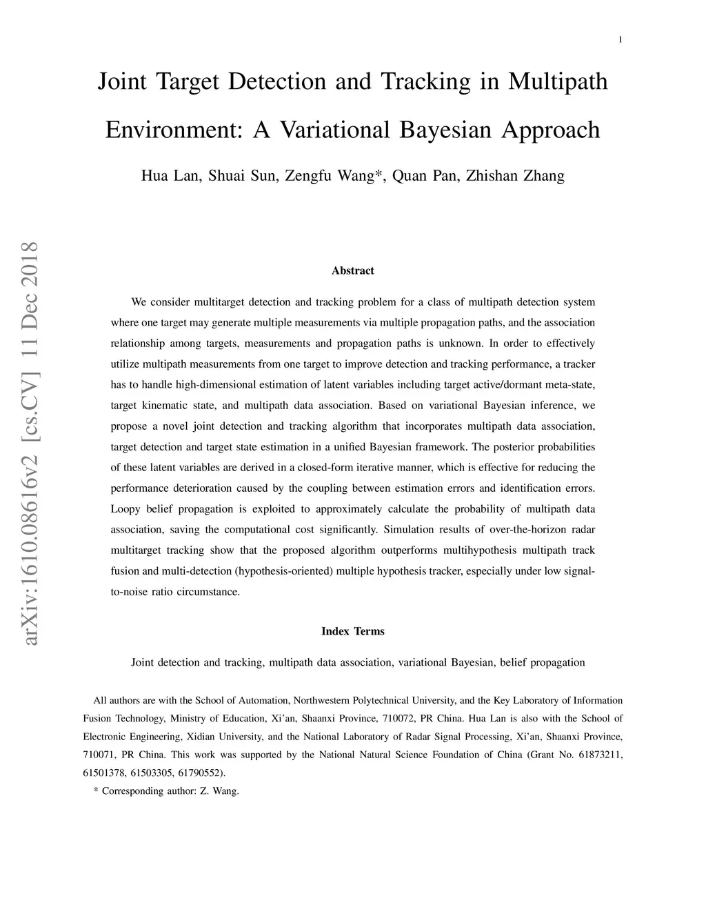 We consider multitarget detection and tracking problem for a class of multipath detection system where one target may generate multiple measurements via multiple propagation paths, and the association relationship among targets, measurements and propagation paths is unknown. In order to effectively utilize multipath measurements from one target to improve detection and tracking performance, a tracker has to handle high-dimensional estimation of latent variables including target active/dormant meta-state, target kinematic state, and multipath data association. Based on variational Bayesian inference, we propose a novel joint detection and tracking algorithm that incorporates multipath data association, target detection and target state estimation in a unified Bayesian framework. The posterior probabilities of these latent variables are derived in a closed-form iterative manner, which is effective for reducing the performance deterioration caused by the coupling between estimation errors and identification errors. Loopy belief propagation is exploited to approximately calculate the probability of multipath data association, saving the computational cost significantly. Simulation results of over-the-horizon radar multitarget tracking show that the proposed algorithm outperforms multihypothesis multipath track fusion and multi-detection (hypothesis-oriented) multiple hypothesis tracker, especially under low signal-to-noise ratio circumstance.