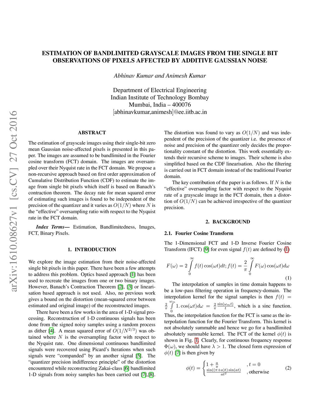 The estimation of grayscale images using their single-bit zero mean Gaussian noise-affected pixels is presented in this paper. The images are assumed to be bandlimited in the Fourier Cosine transform (FCT) domain. The images are oversampled over their Nyquist rate in the FCT domain. We propose a non-recursive approach based on first order approximation of Cumulative Distribution Function (CDF) to estimate the image from single bit pixels which itself is based on Banach's contraction theorem. The decay rate for mean squared error of estimating such images is found to be independent of the precision of the quantizer and it varies as where is the "effective" oversampling ratio with respect to the Nyquist rate in the FCT domain.