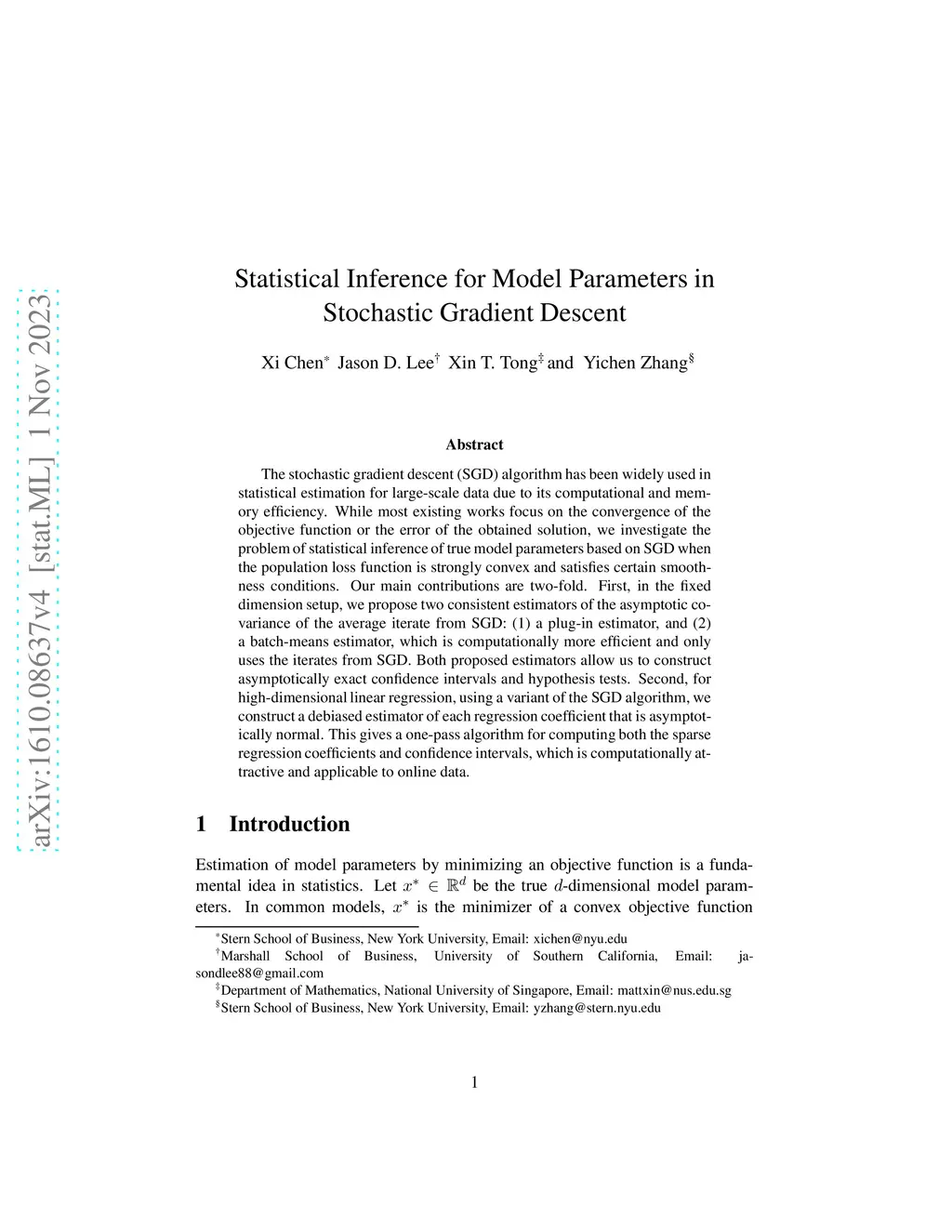 The stochastic gradient descent (SGD) algorithm has been widely used in statistical estimation for large-scale data due to its computational and memory efficiency. While most existing works focus on the convergence of the objective function or the error of the obtained solution, we investigate the problem of statistical inference of true model parameters based on SGD when the population loss function is strongly convex and satisfies certain smoothness conditions. Our main contributions are two-fold. First, in the fixed dimension setup, we propose two consistent estimators of the asymptotic covariance of the average iterate from SGD: (1) a plug-in estimator, and (2) a batch-means estimator, which is computationally more efficient and only uses the iterates from SGD. Both proposed estimators allow us to construct asymptotically exact confidence intervals and hypothesis tests. Second, for high-dimensional linear regression, using a variant of the SGD algorithm, we construct a debiased estimator of each regression coefficient that is asymptotically normal. This gives a one-pass algorithm for computing both the sparse regression coefficients and confidence intervals, which is computationally attractive and applicable to online data.