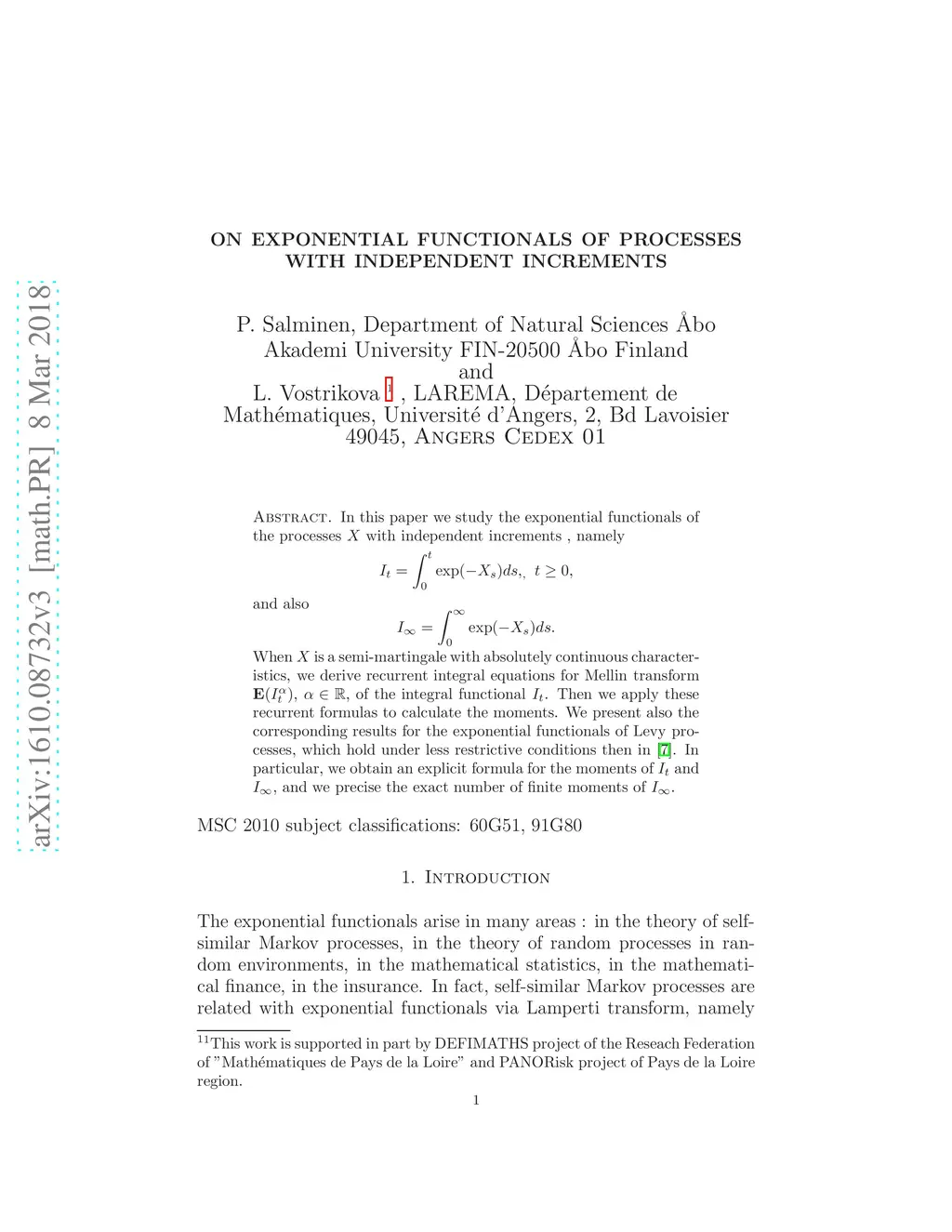 In this paper we study the exponential functionals of the processes with independent increments , namely and also When is a semi-martingale with absolutely continuous characteristics, we derive recurrent integral equations for Mellin transform , , of the integral functional . Then we apply these recurrent formulas to calculate the moments. We present also the corresponding results for the exponential functionals of Levy processes, which hold under less restrictive conditions then in the paper of Bertoin, Yor (2005). In particular, we obtain an explicit formula for the moments of and , and we precise the exact number of finite moments of .