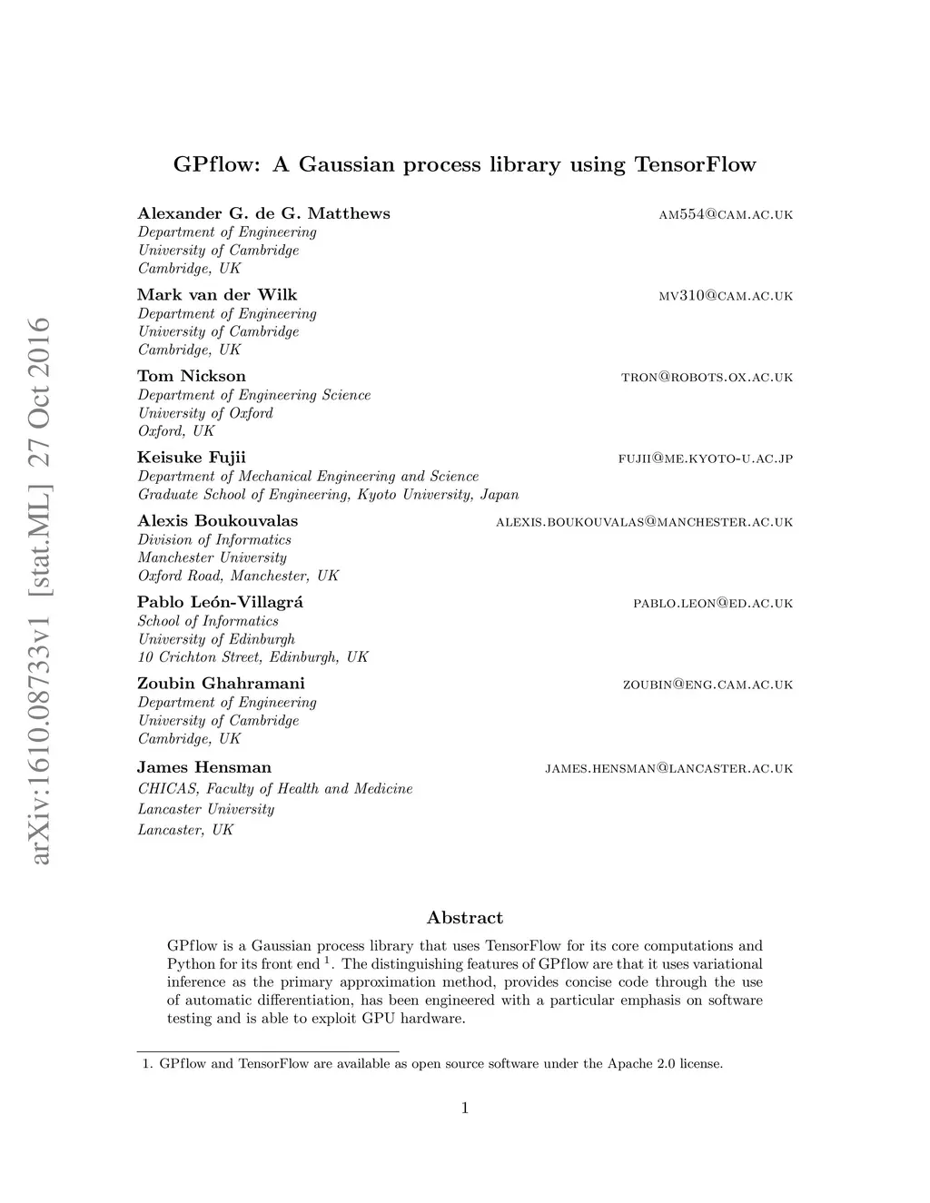 GPflow is a Gaussian process library that uses TensorFlow for its core computations and Python for its front end. The distinguishing features of GPflow are that it uses variational inference as the primary approximation method, provides concise code through the use of automatic differentiation, has been engineered with a particular emphasis on software testing and is able to exploit GPU hardware.