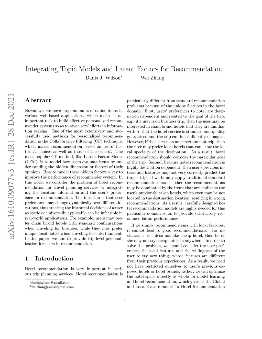 Nowadays, we have large amounts of online items in various web-based applications, which makes it an important task to build effective personalized recommender systems so as to save users' efforts in information seeking. One of the most extensively and successfully used methods for personalized recommendation is the Collaborative Filtering (CF) technique, which makes recommendation based on users' historical choices as well as those of the others'. The most popular CF method, like Latent Factor Model (LFM), is to model how users evaluate items by understanding the hidden dimension or factors of their opinions. How to model these hidden factors is key to improve the performance of recommender system. In this work, we consider the problem of hotel recommendation for travel planning services by integrating the location information and the user's preference for recommendation. The intuition is that user preferences may change dynamically over different locations, thus treating the historical decisions of a user as static or universally applicable can be infeasible in real-world applications. For example, users may prefer chain brand hotels with standard configurations when traveling for business, while they may prefer unique local hotels when traveling for entertainment. In this paper, we aim to provide trip-level personalization for users in recommendation.