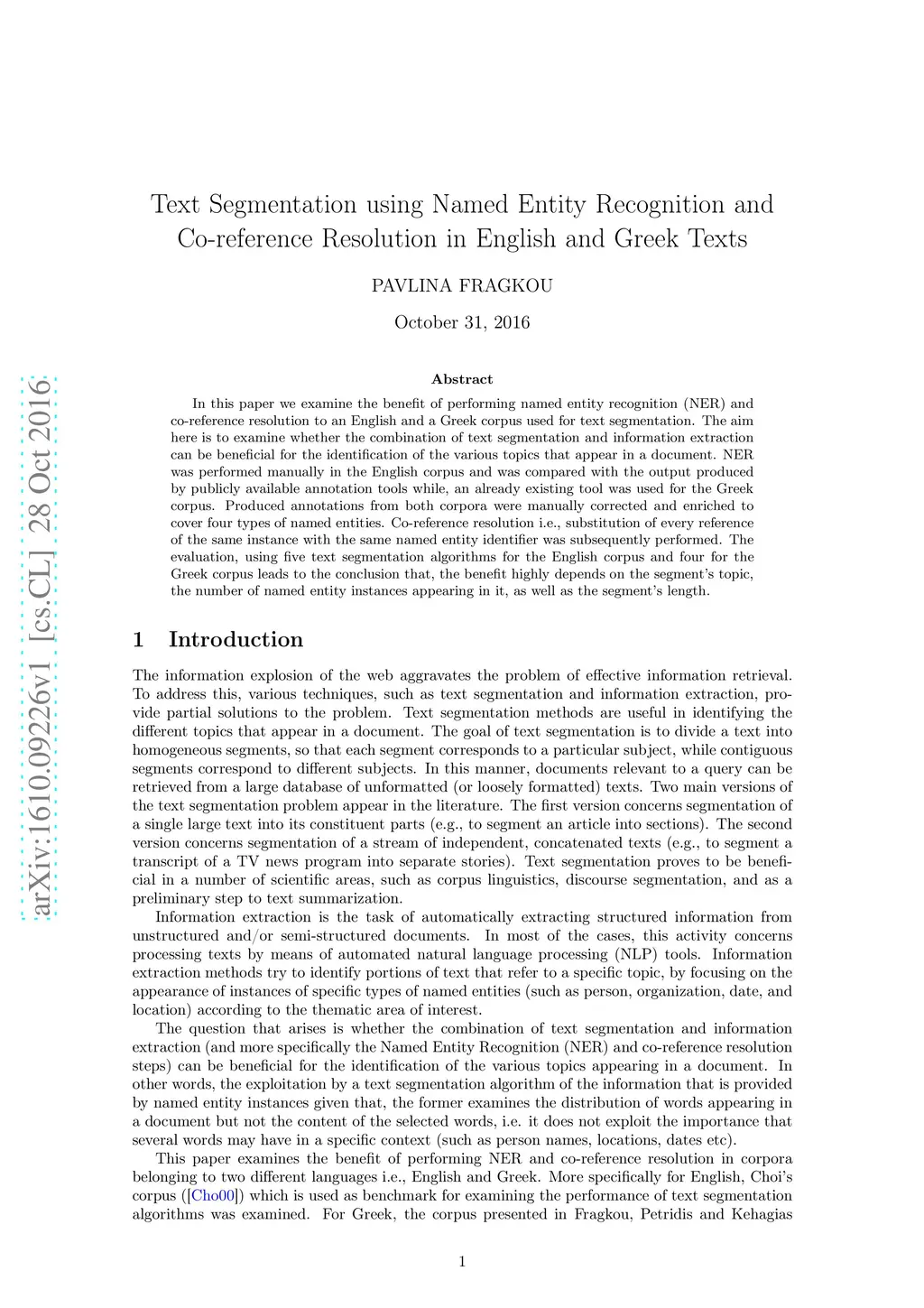 In this paper we examine the benefit of performing named entity recognition (NER) and co-reference resolution to an English and a Greek corpus used for text segmentation. The aim here is to examine whether the combination of text segmentation and information extraction can be beneficial for the identification of the various topics that appear in a document. NER was performed manually in the English corpus and was compared with the output produced by publicly available annotation tools while, an already existing tool was used for the Greek corpus. Produced annotations from both corpora were manually corrected and enriched to cover four types of named entities. Co-reference resolution i.e., substitution of every reference of the same instance with the same named entity identifier was subsequently performed. The evaluation, using five text segmentation algorithms for the English corpus and four for the Greek corpus leads to the conclusion that, the benefit highly depends on the segment's topic, the number of named entity instances appearing in it, as well as the segment's length.