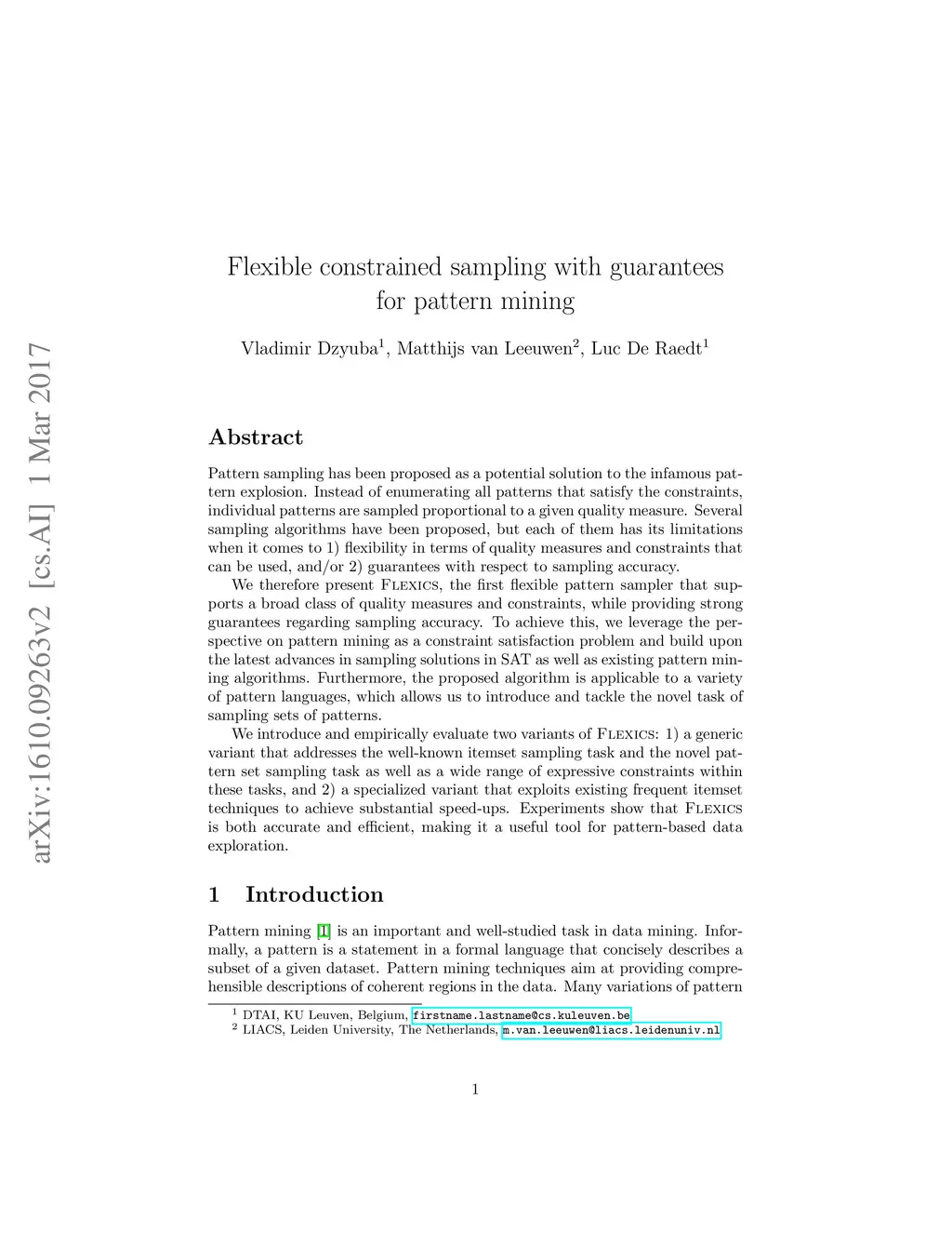 Pattern sampling has been proposed as a potential solution to the infamous pattern explosion. Instead of enumerating all patterns that satisfy the constraints, individual patterns are sampled proportional to a given quality measure. Several sampling algorithms have been proposed, but each of them has its limitations when it comes to 1) flexibility in terms of quality measures and constraints that can be used, and/or 2) guarantees with respect to sampling accuracy. We therefore present Flexics, the first flexible pattern sampler that supports a broad class of quality measures and constraints, while providing strong guarantees regarding sampling accuracy. To achieve this, we leverage the perspective on pattern mining as a constraint satisfaction problem and build upon the latest advances in sampling solutions in SAT as well as existing pattern mining algorithms. Furthermore, the proposed algorithm is applicable to a variety of pattern languages, which allows us to introduce and tackle the novel task of sampling sets of patterns. We introduce and empirically evaluate two variants of Flexics: 1) a generic variant that addresses the well-known itemset sampling task and the novel pattern set sampling task as well as a wide range of expressive constraints within these tasks, and 2) a specialized variant that exploits existing frequent itemset techniques to achieve substantial speed-ups. Experiments show that Flexics is both accurate and efficient, making it a useful tool for pattern-based data exploration.