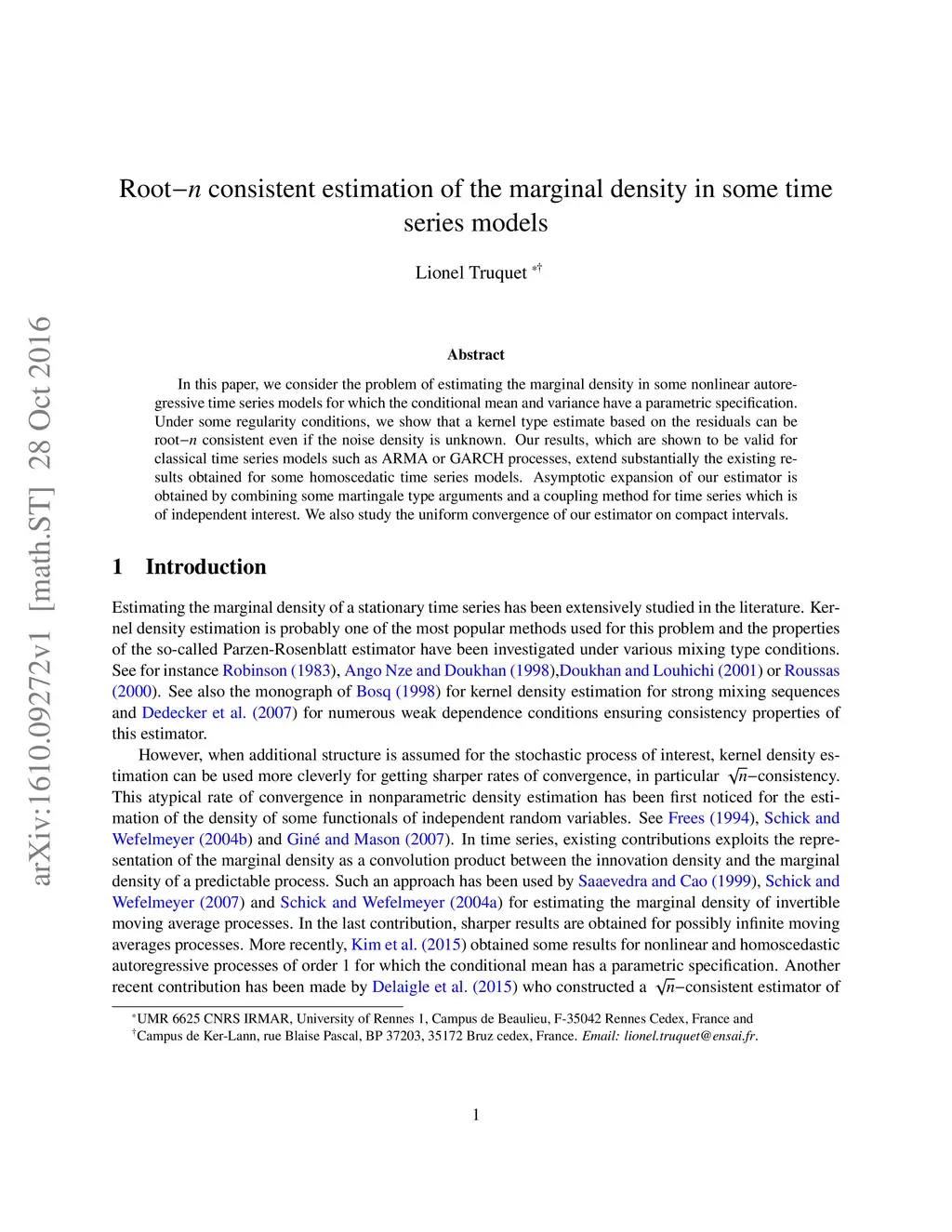 In this paper, we consider the problem of estimating the marginal density in some nonlinear autoregressive time series models for which the conditional mean and variance have a parametric specification. Under some regularity conditions, we show that a kernel type estimate based on the residuals can be root-n consistent even if the noise density is unknown. Our results, which are shown to be valid for classical time series models such as ARMA or GARCH processes, extend substantially the existing results obtained for some homoscedatic time series models. Asymptotic expansion of our estimator is obtained by combining some martingale type arguments and a coupling method for time series which is of independent interest. We also study the uniform convergence of our estimator on compact intervals.