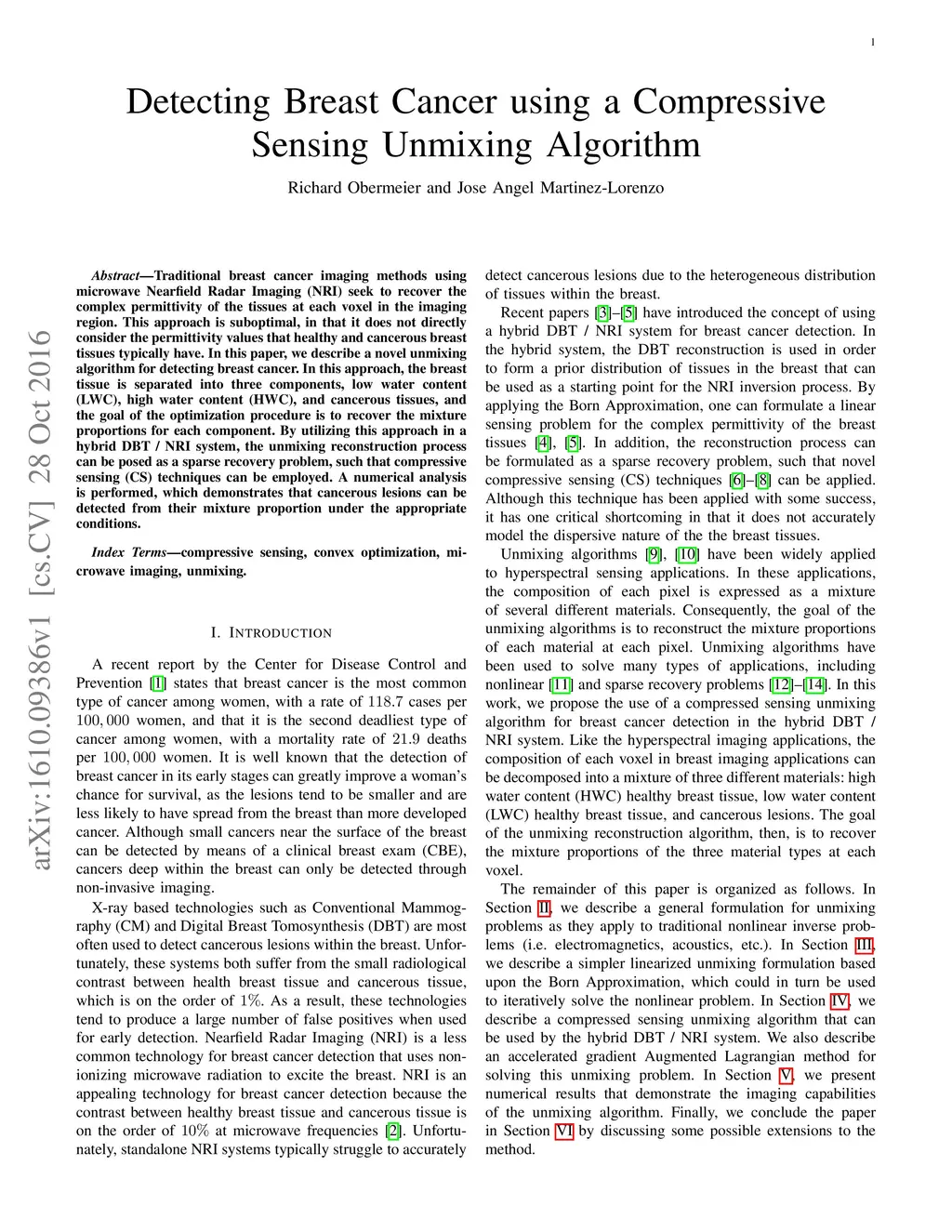 Detecting Breast Cancer using a Compressive Sensing Unmixing Algorithm